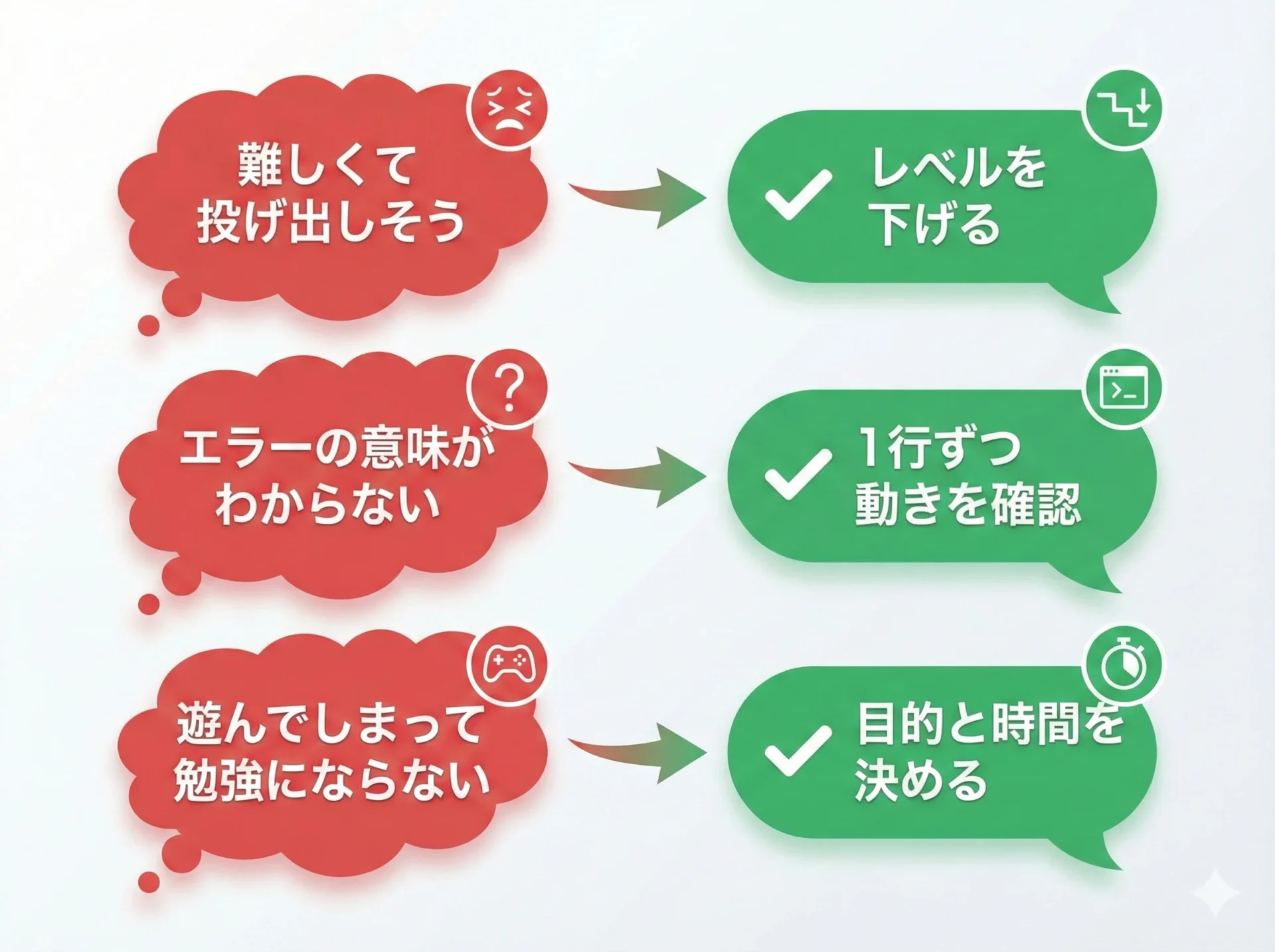 特に、うまく動かないときに「どこまでできているか」「どこからうまくいっていないか」を一緒に確認してあげると、デバッグ(問題を見つけて直す作業)の考え方が自然と身につきます。