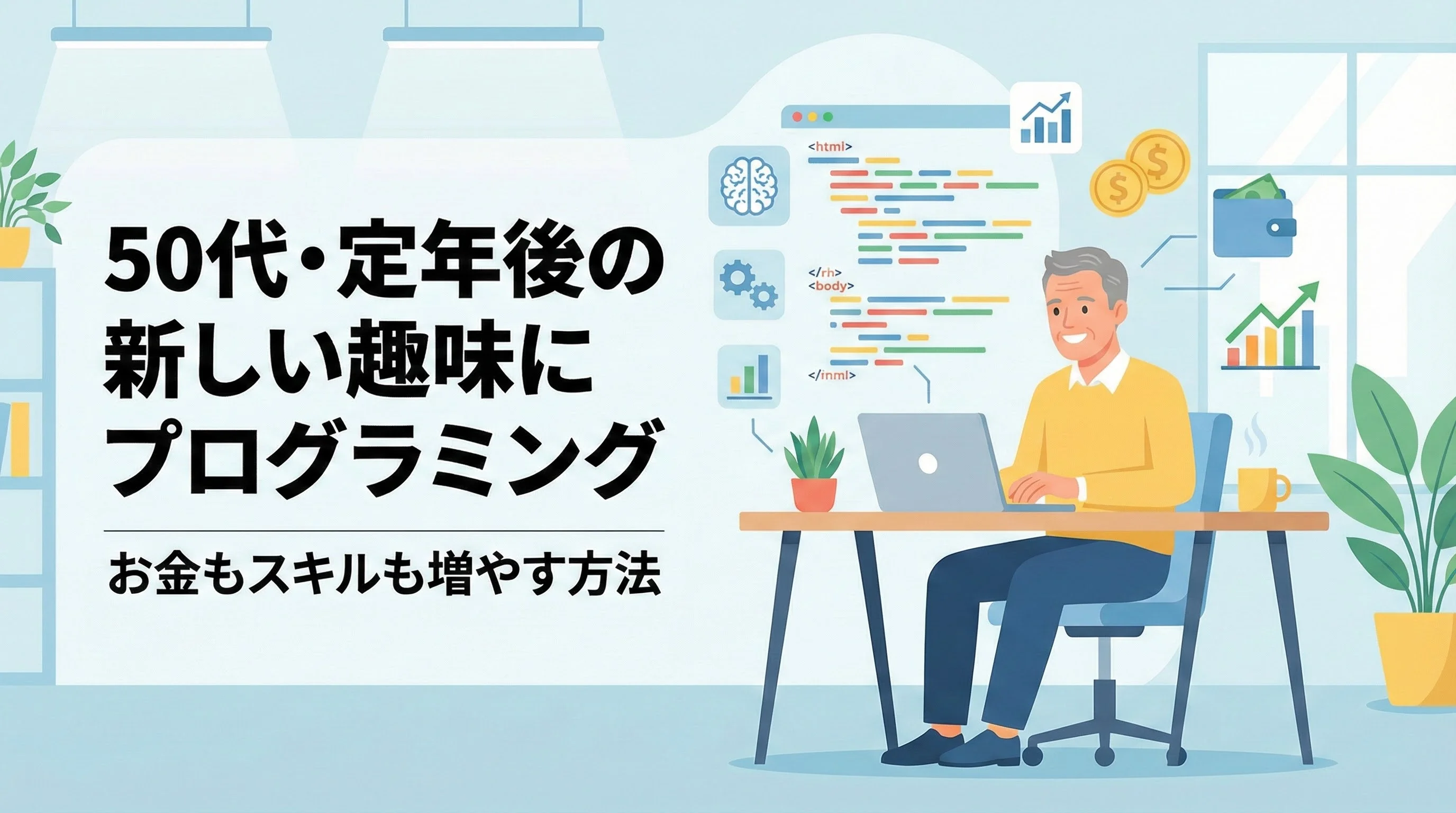 新しい趣味を探している今こそ、プログラミングを通じてお金もスキルも少しずつ増やしていく人生の後半戦をスタートしてみてはいかがでしょうか。