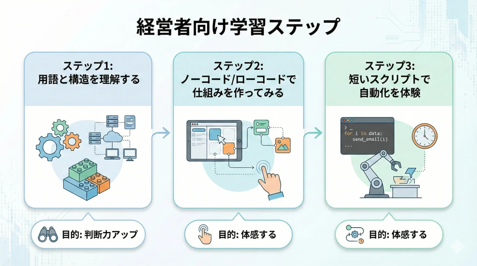 基礎概念と考え方を理解し、簡単なコードやノーコードツールを通じて「体感としての理解」を得ることで、十分に経営判断の質は変わります。