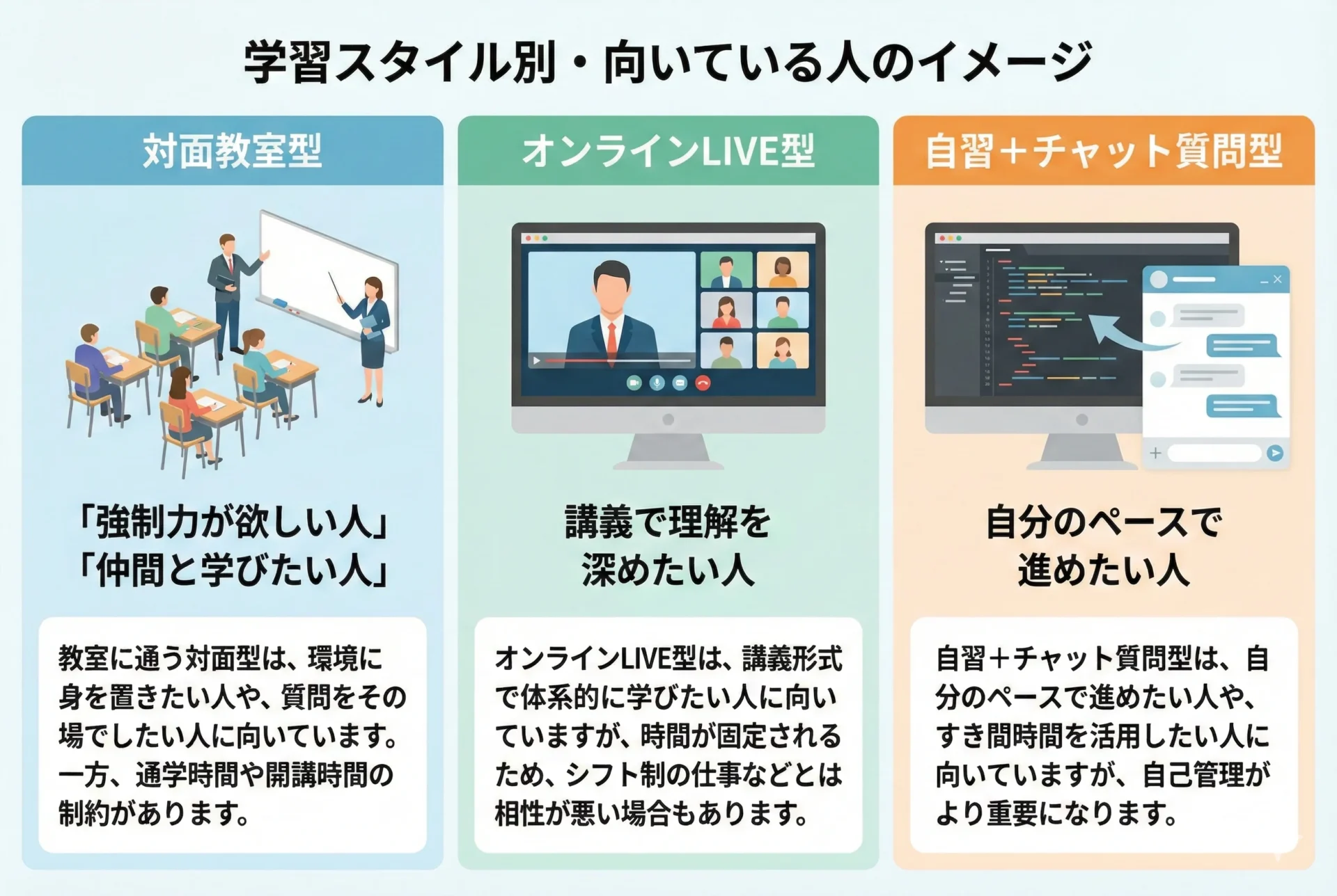 いくらカリキュラムが良くても、サポート体制が自分の学び方に合っていないと挫折しやすくなります。