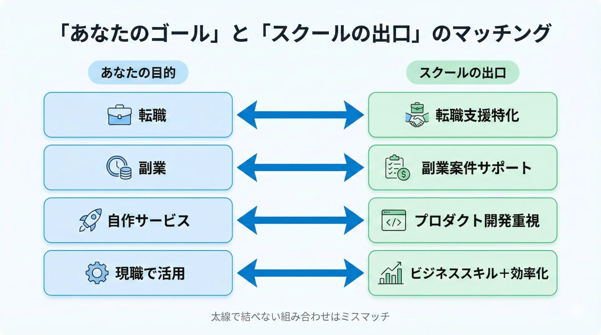 この軸が曖昧なままスクールを選ぶと、「転職支援が厚いスクールに入ったのに、副業の話が全く出てこない」「自作サービスを作りたいのに、ポートフォリオは転職用前提」といったミスマッチが起きます。