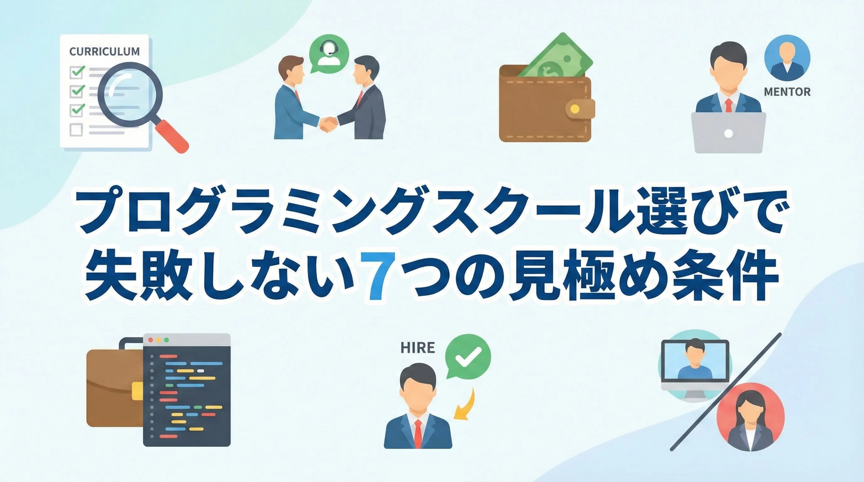 プログラミングスクール選びで失敗しないためには、派手なキャッチコピーや料金だけで判断せず、自分のゴールとスクールの「出口」の一致を起点に、次の7つの条件を冷静に見極めることが重要です。