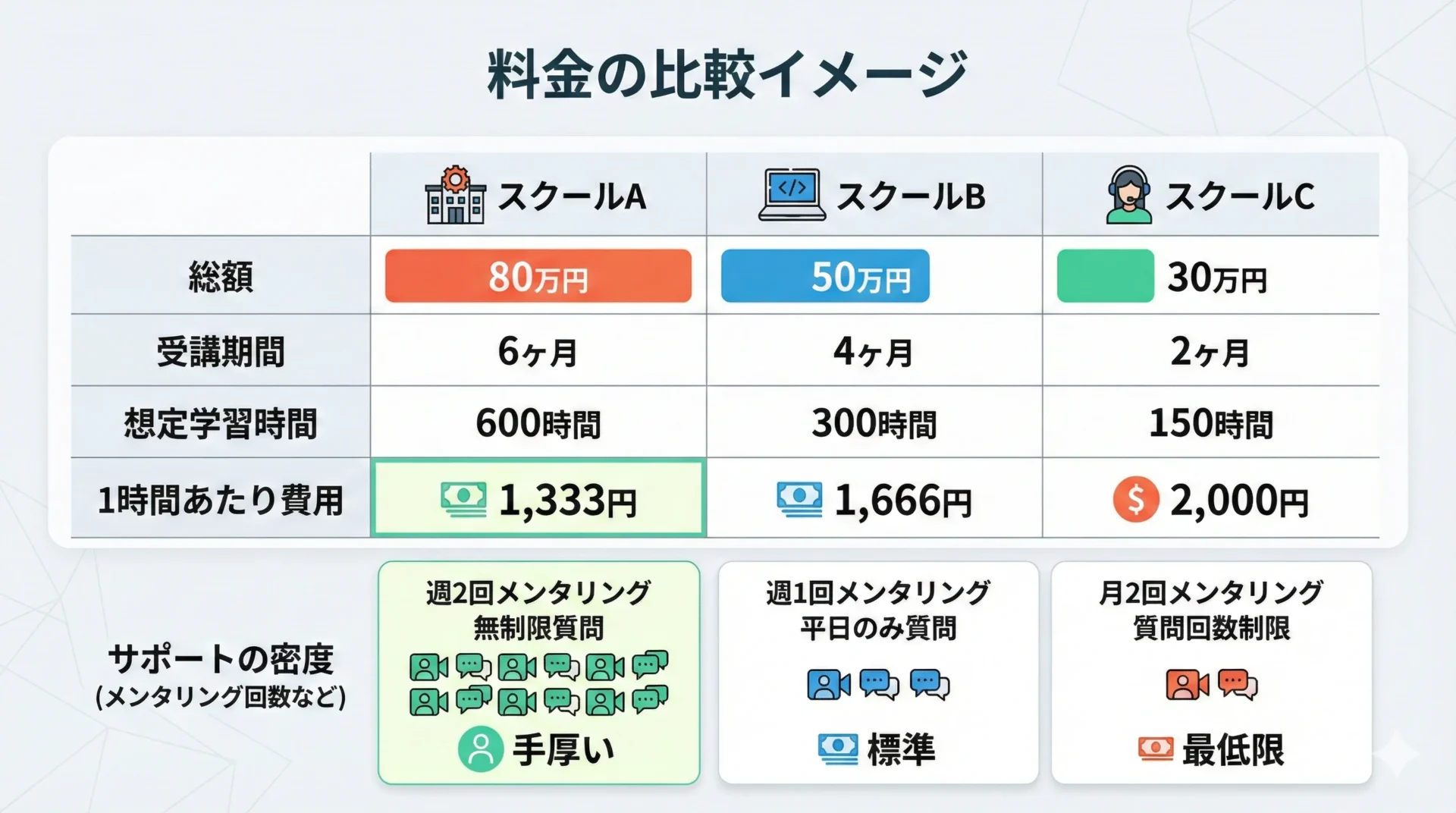 同じ30万円でも、「教材メイン+質問少なめ」のスクールと、「手厚いメンタリング+転職支援付き」のスクールでは、得られる価値は大きく異なります。