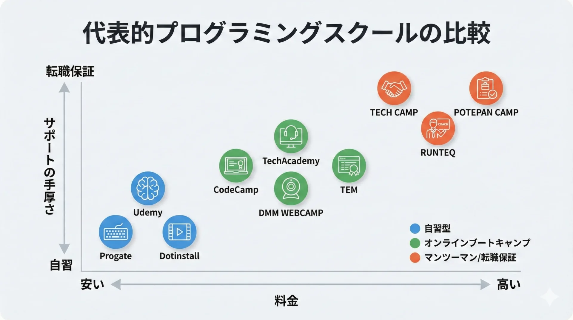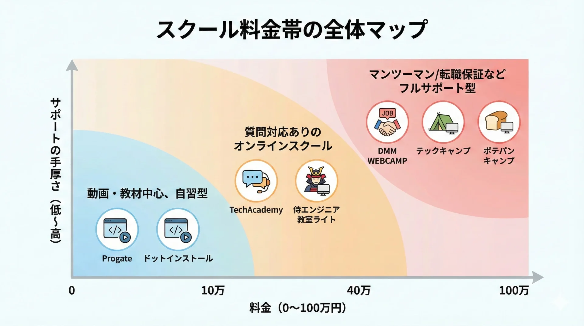 ここまで紹介したスクールを、料金と学習スタイルの観点で整理してみましょう。
