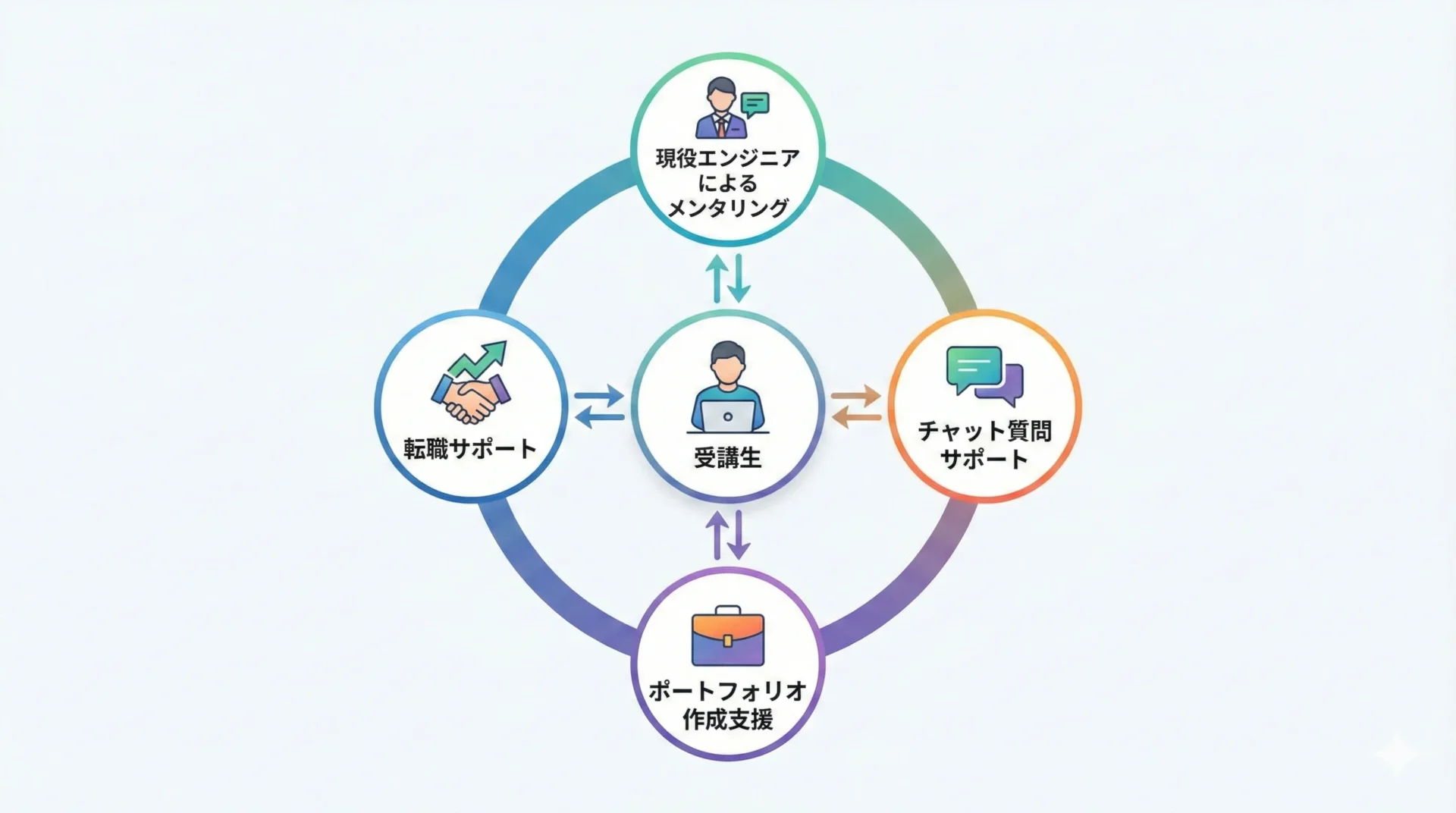 - 現役エンジニアがメンターとしてつくマンツーマンサポート