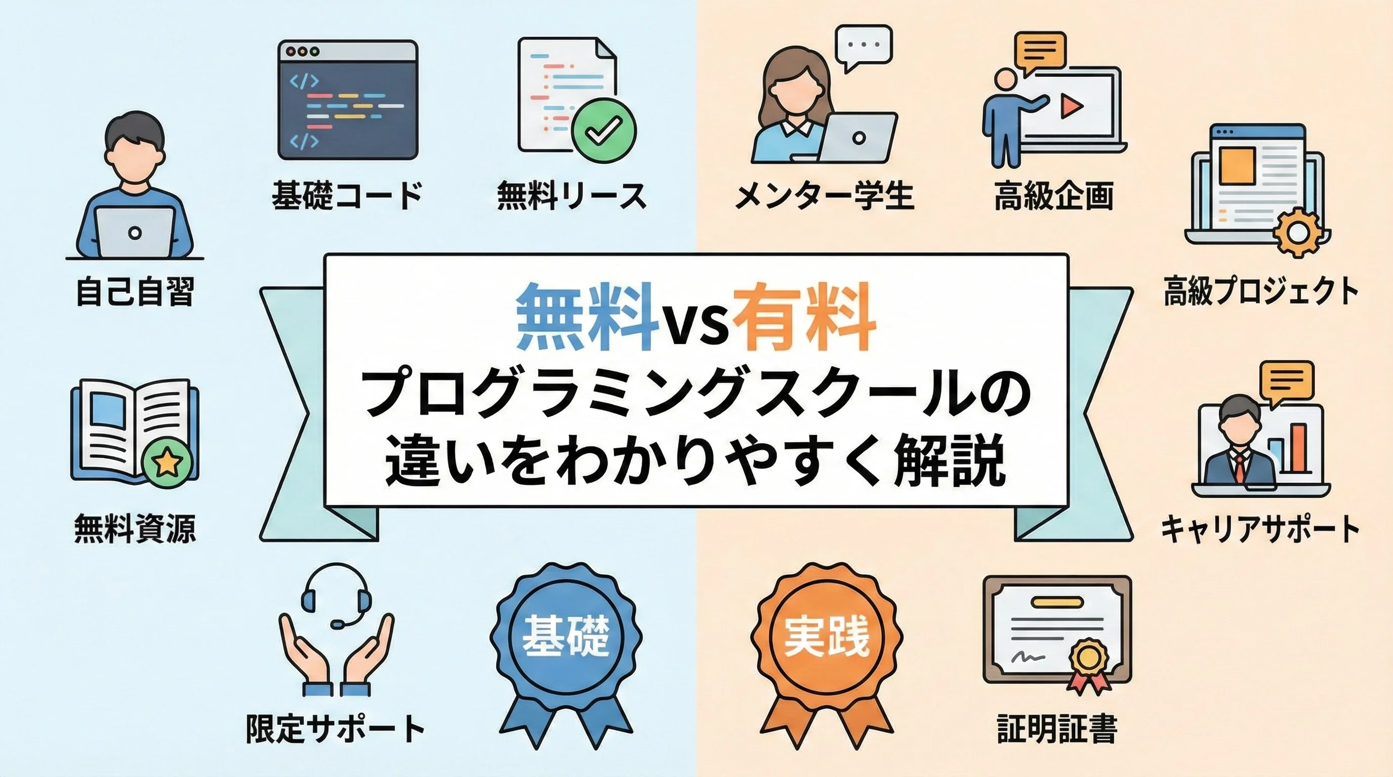 無料と有料のプログラミングスクールは、単に「値段が違う」だけでなく、ビジネスモデル・サポート内容・卒業後のキャリアの選択肢まで含めて構造が異なります。