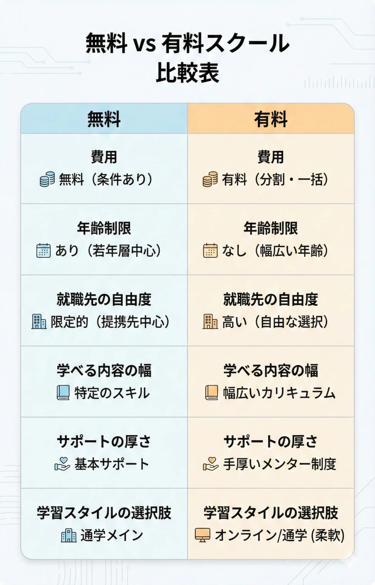 ここまでの内容を踏まえ、無料スクールと有料スクールの違いをいくつかの観点で整理します。