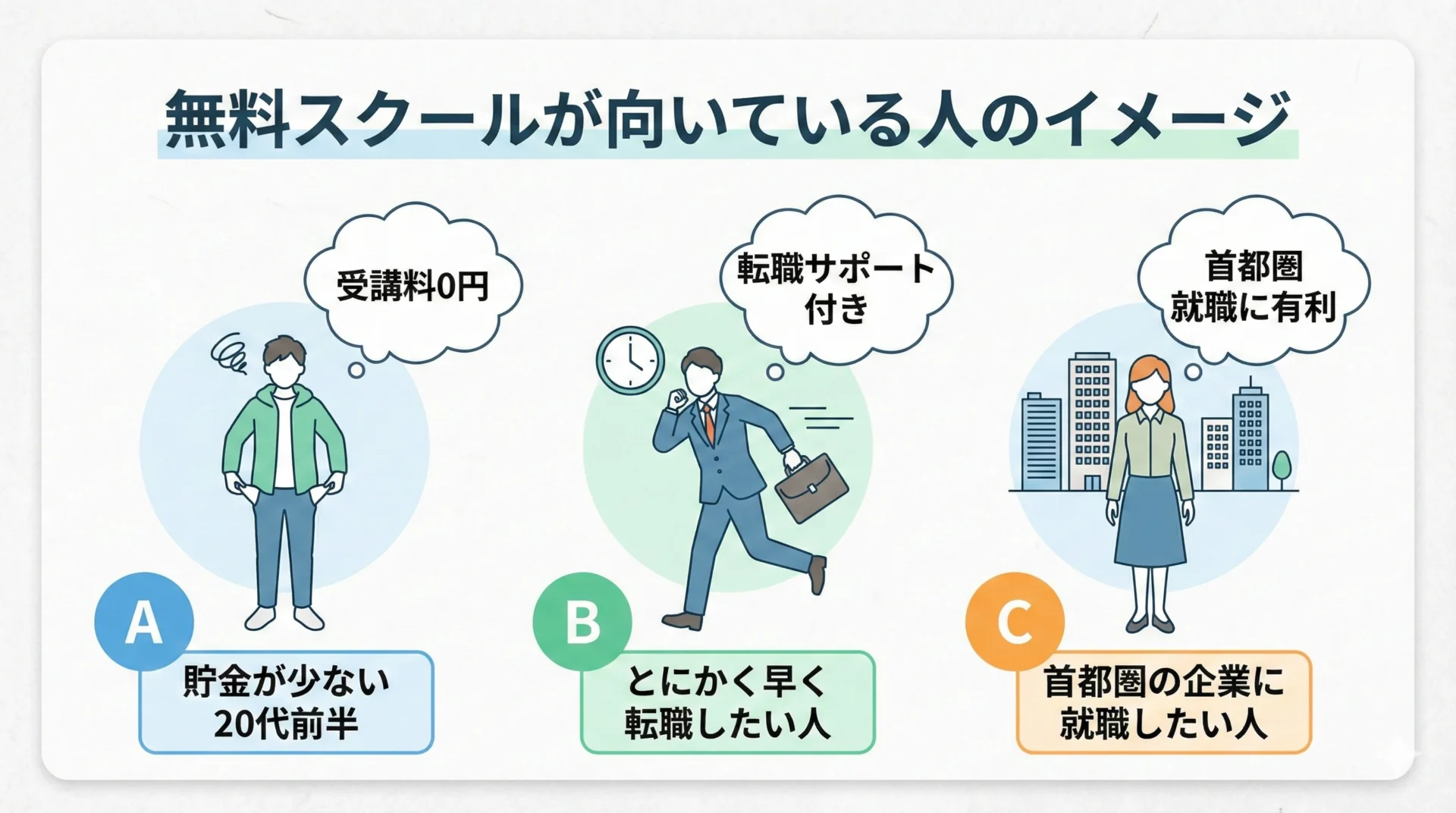 「まずは未経験からエンジニアになること」が目的であり、「どの企業・どの技術スタックか」は後から考えるというスタンスなら、無料スクールの価値は大きいと言えます。