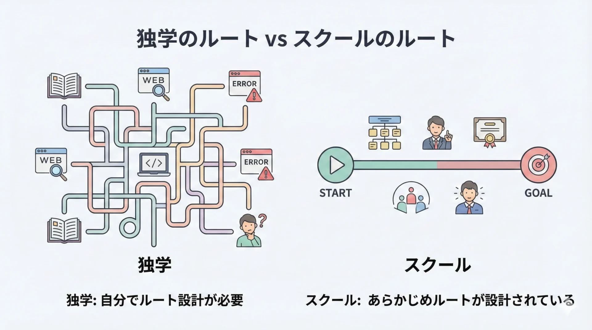 独学で十分に進められる人にとっては、スクールはコストに見合わない選択肢かもしれません。