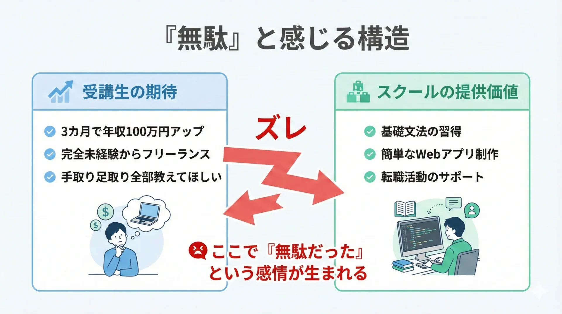つまり、プログラミングスクールが本質的に「無駄」なのではなく、自分の目的・状況・期待値とスクールの提供価値がズレているときに無駄になりやすいのです。