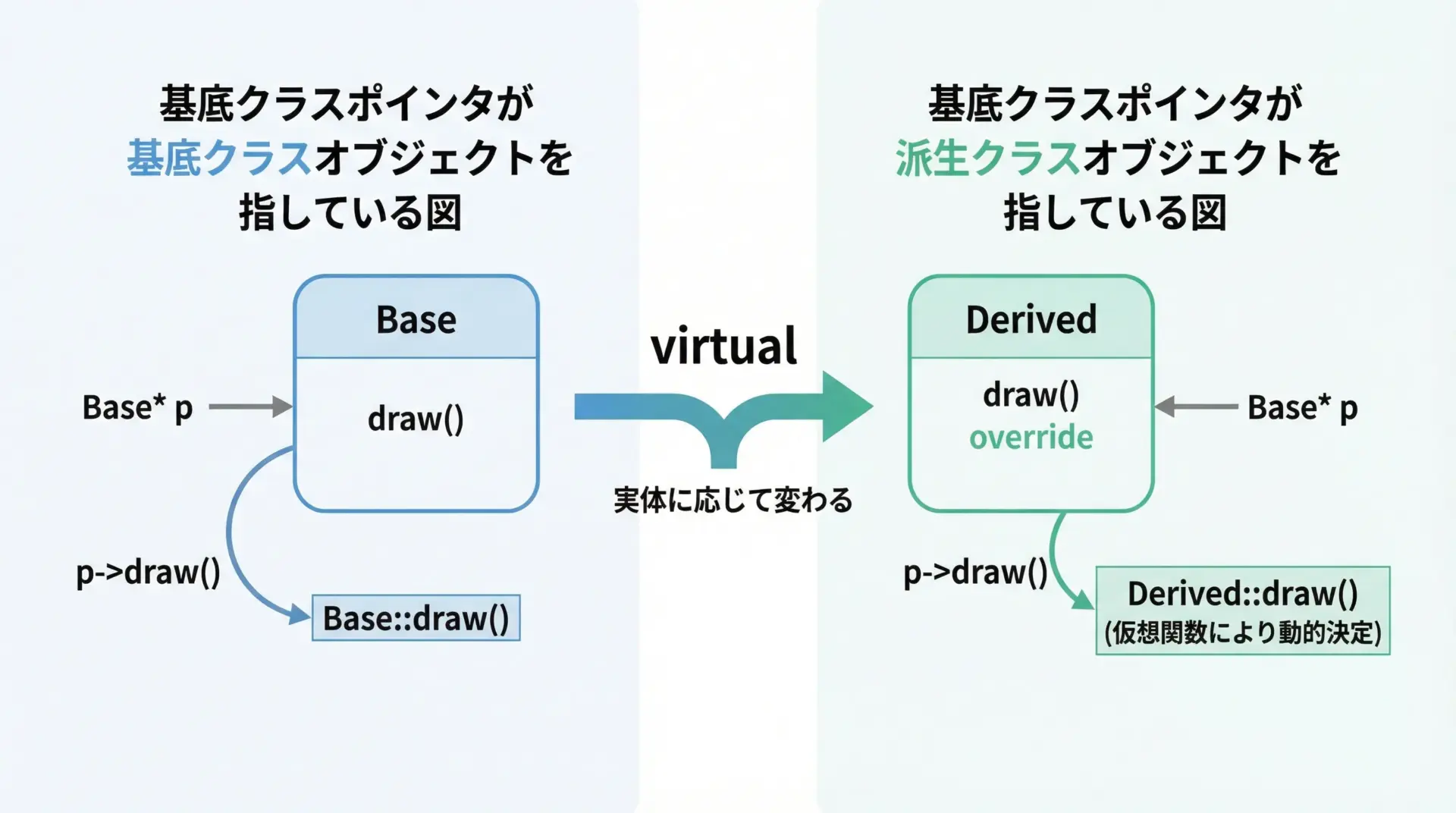 これにより、基底クラスのポインタや参照を使っていても、派生クラス側の処理を自然に呼び出すことができます。