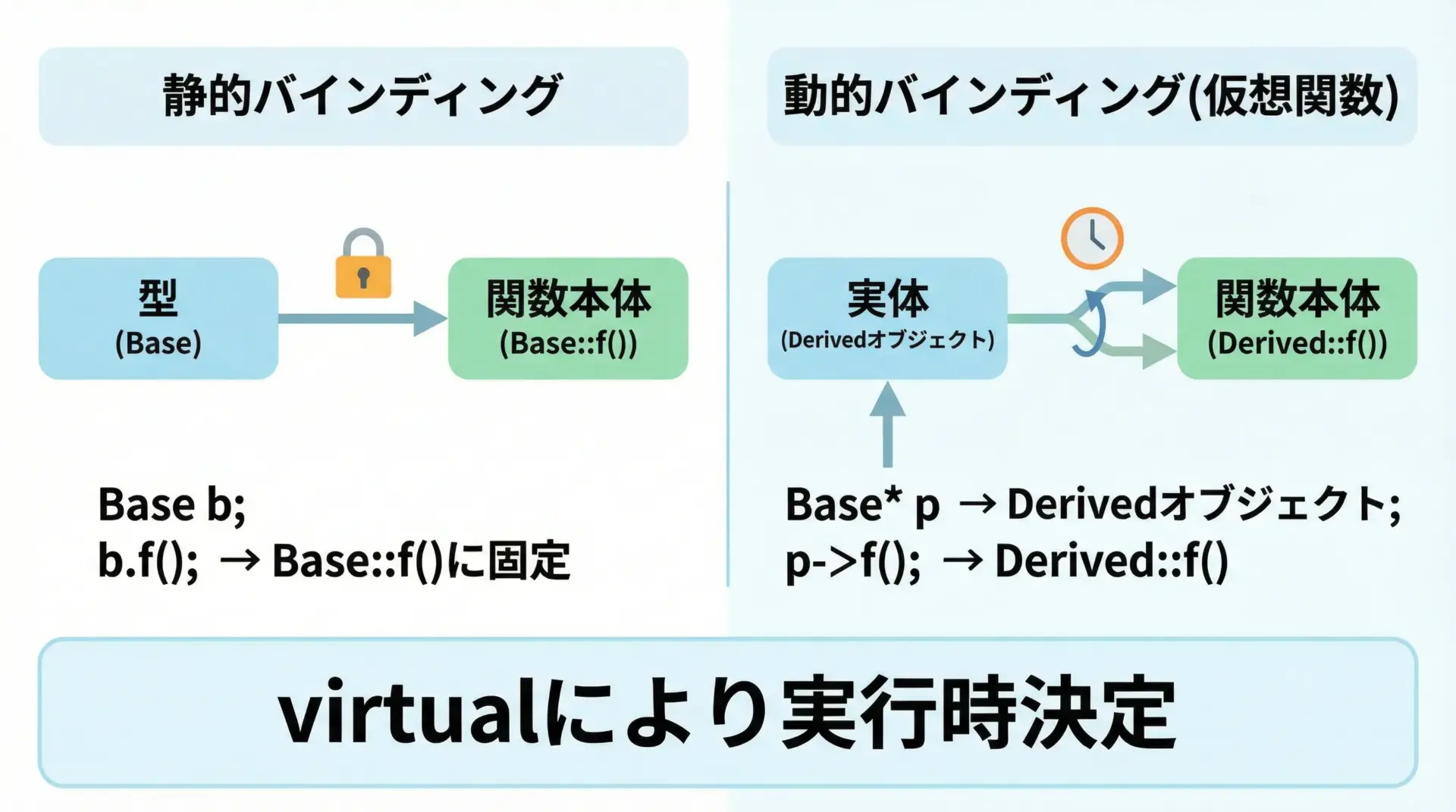 一方、仮想関数では実行時に実体に応じて関数が決まるため「動的バインディング」と呼ばれます。