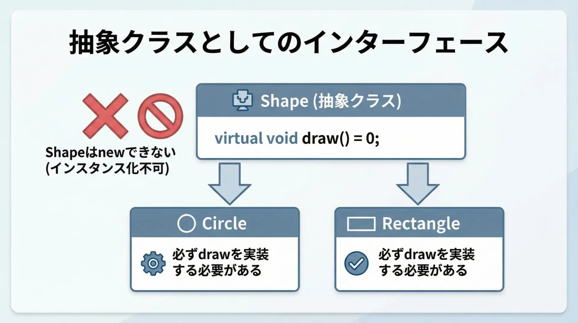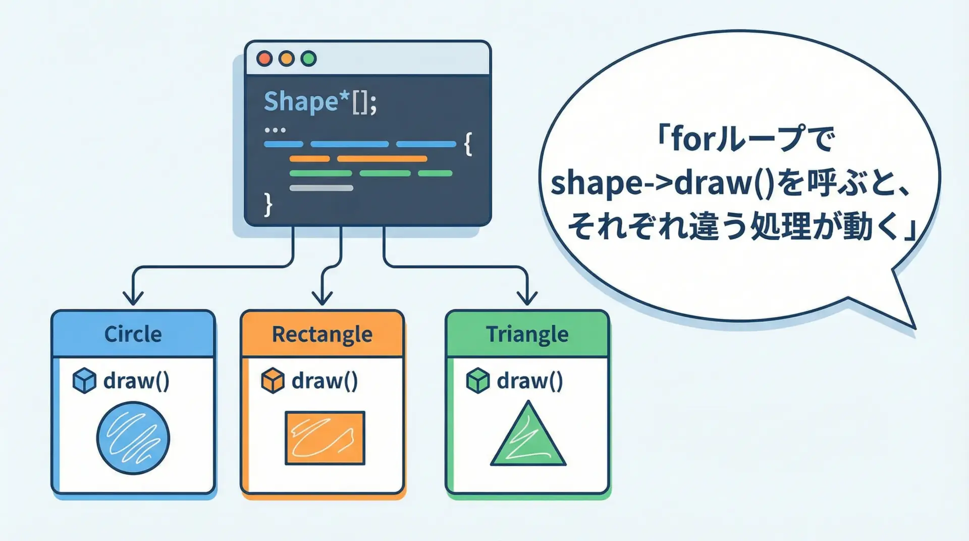 このとき、仮想関数を使うと、図形の種類を意識せず「とにかくdrawを呼ぶ」だけで、適切な描画処理が実行されます。