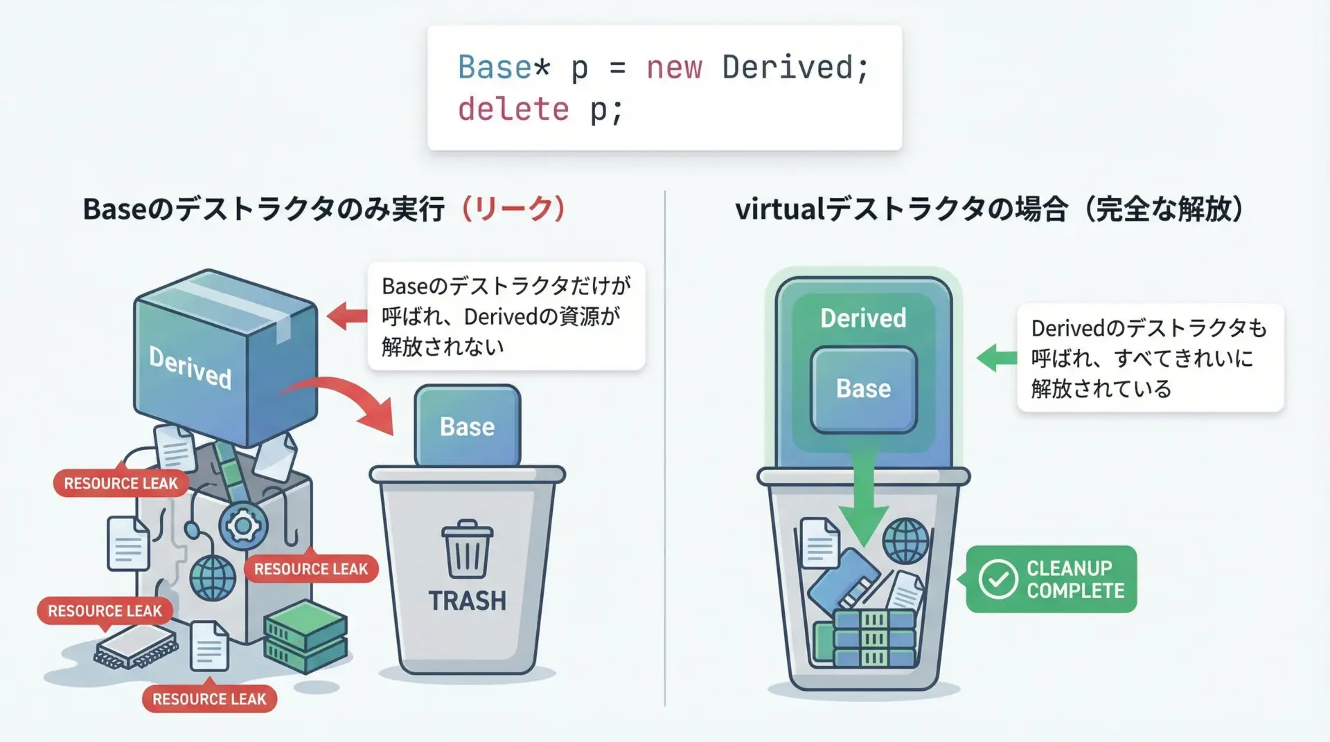 基底クラスのポインタ経由で派生クラスのオブジェクトをdeleteする場合、デストラクタが仮想関数でないと派生クラス側のデストラクタが呼ばれず、リソースリークの原因になります。