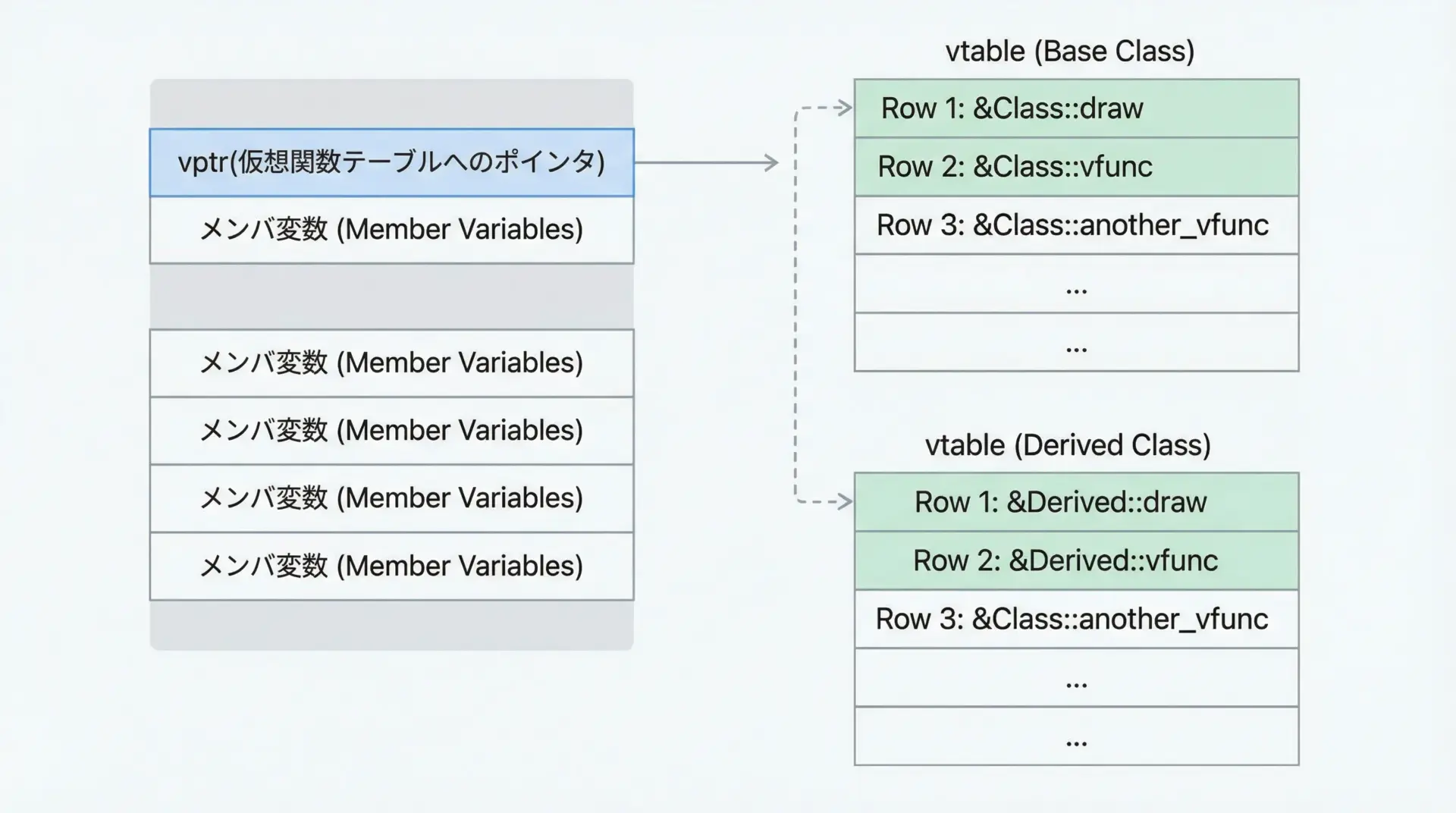 コンパイラは、仮想関数を持つクラスごとに「仮想関数テーブル(vtable)」を用意し、各オブジェクトにはそのテーブルを指すポインタ(vptr)を埋め込むことが多いです。