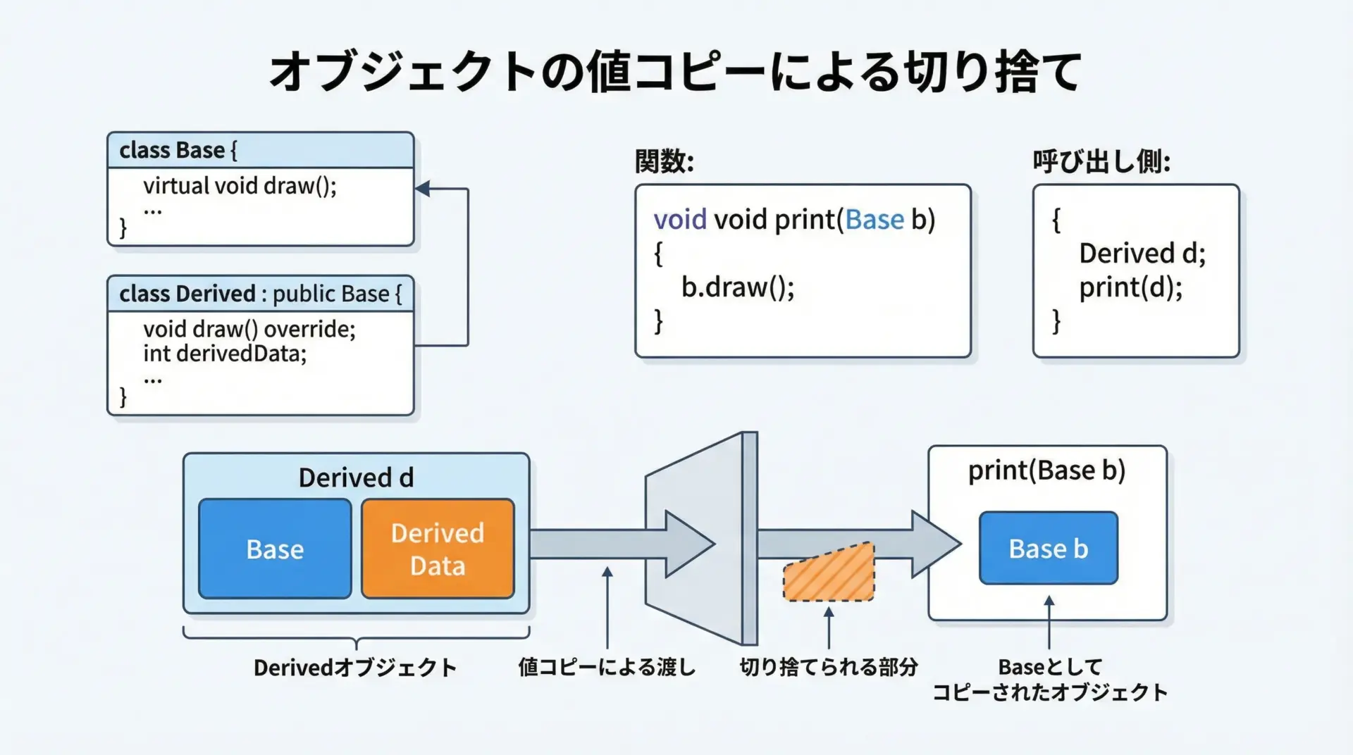 値渡しをすると「オブジェクトの切り詰め(slicing)」が起こり、派生クラスとしての情報が失われてしまいます。