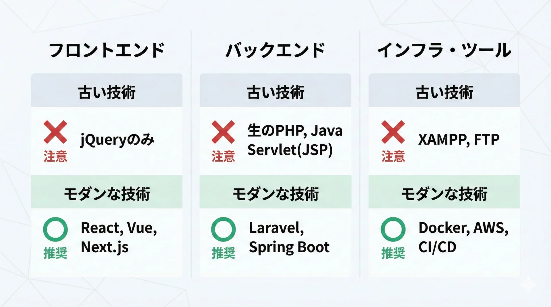 - リスク: 古い技術は就職で不利になり、入社後の苦労も増える。