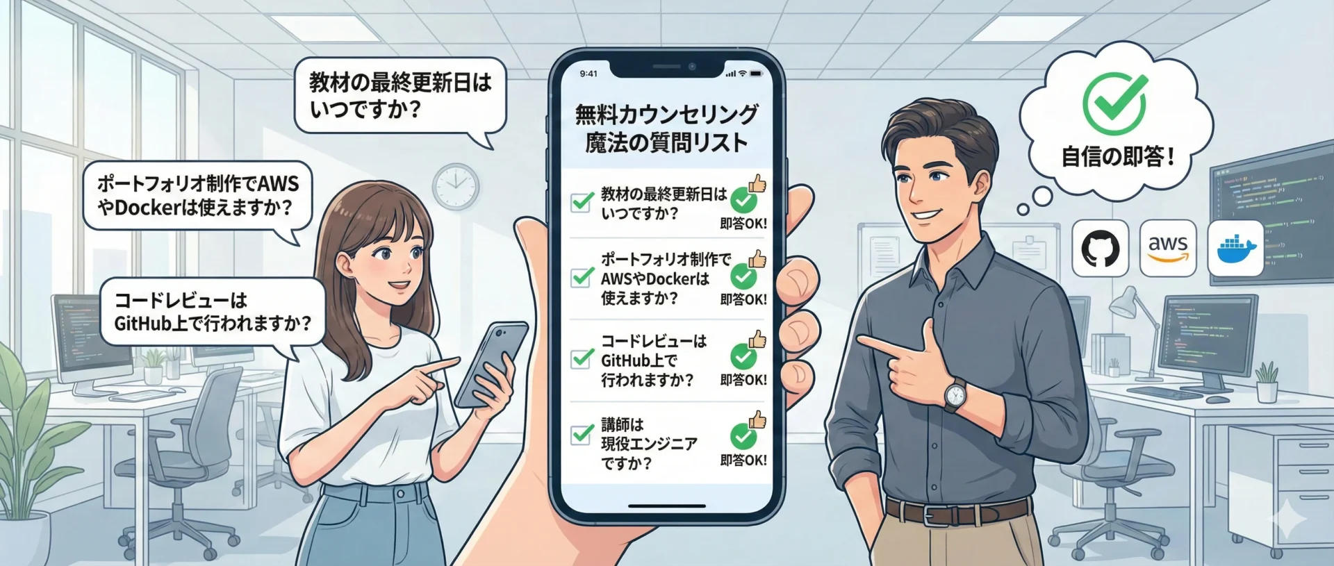 Git、Docker、AWS、モダンなフレームワーク(React,Laravel等)の有無を確認する。 - 確認方法: カウンセリングで「教材の更新頻度」や「デプロイ方法」を具体的に質問する。