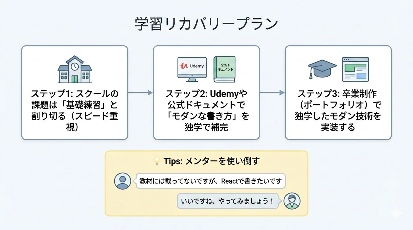 - 対処法: 万が一古くても、スクールを「基礎学習の場」とし、モダン技術は独学とポートフォリオ制作で補完する。