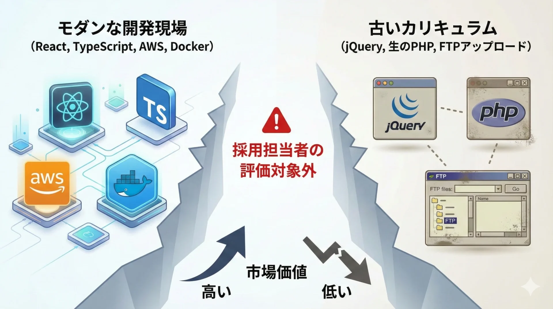 しかし、エンジニアとしてのキャリアを左右する最も本質的な要素は、実は「カリキュラムの新しさ(モダンさ)」にあります。