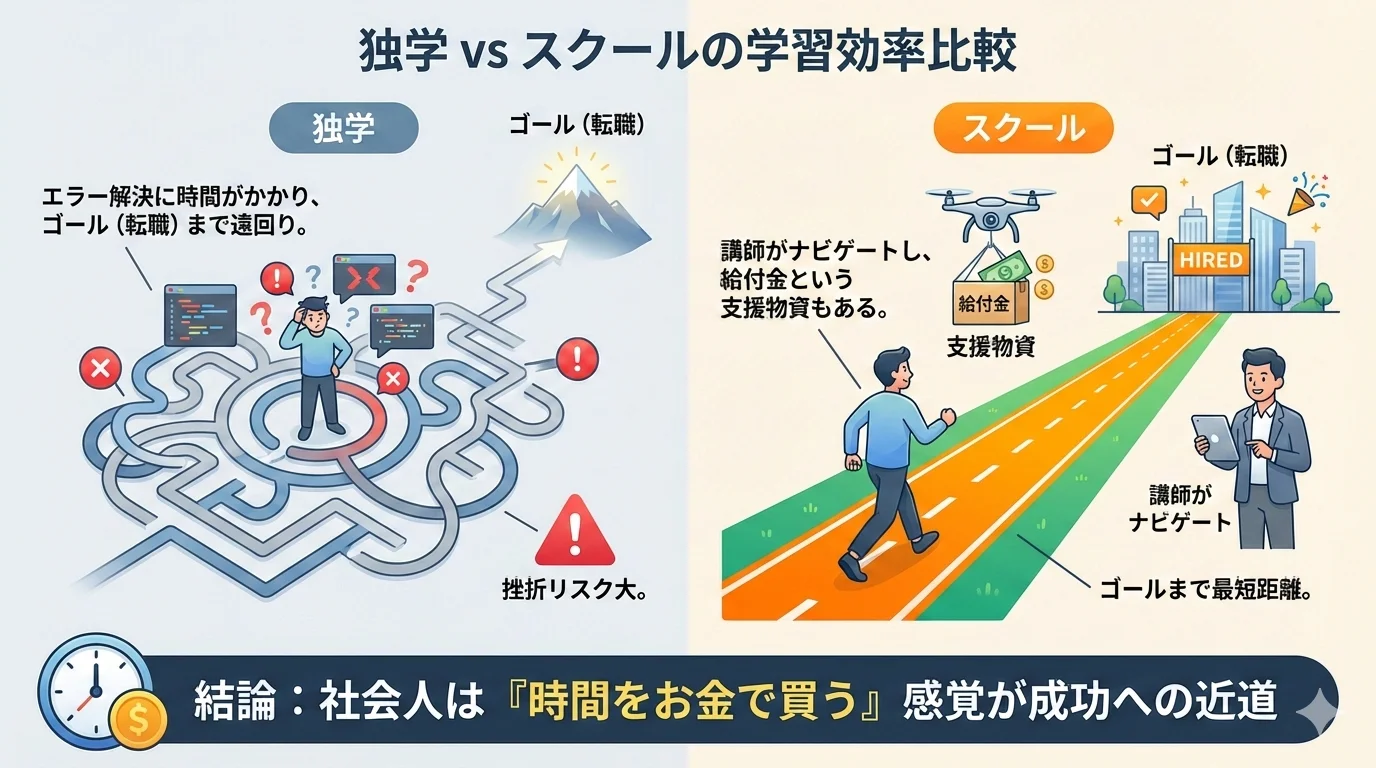 独学で時間を浪費するよりも、給付金を使って質の高い教育を受ける方が、結果的にコストパフォーマンス(時間対効果)は圧倒的に良くなります。