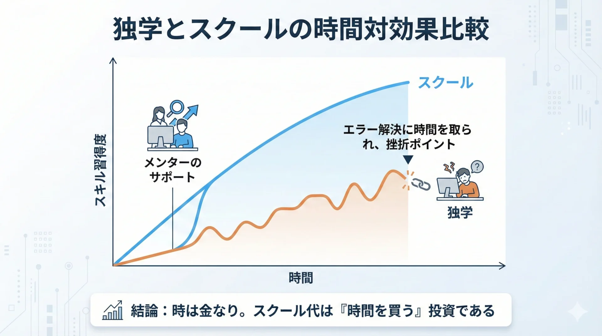 独学の最大のコストは**「時間」と「挫折リスク」**です。