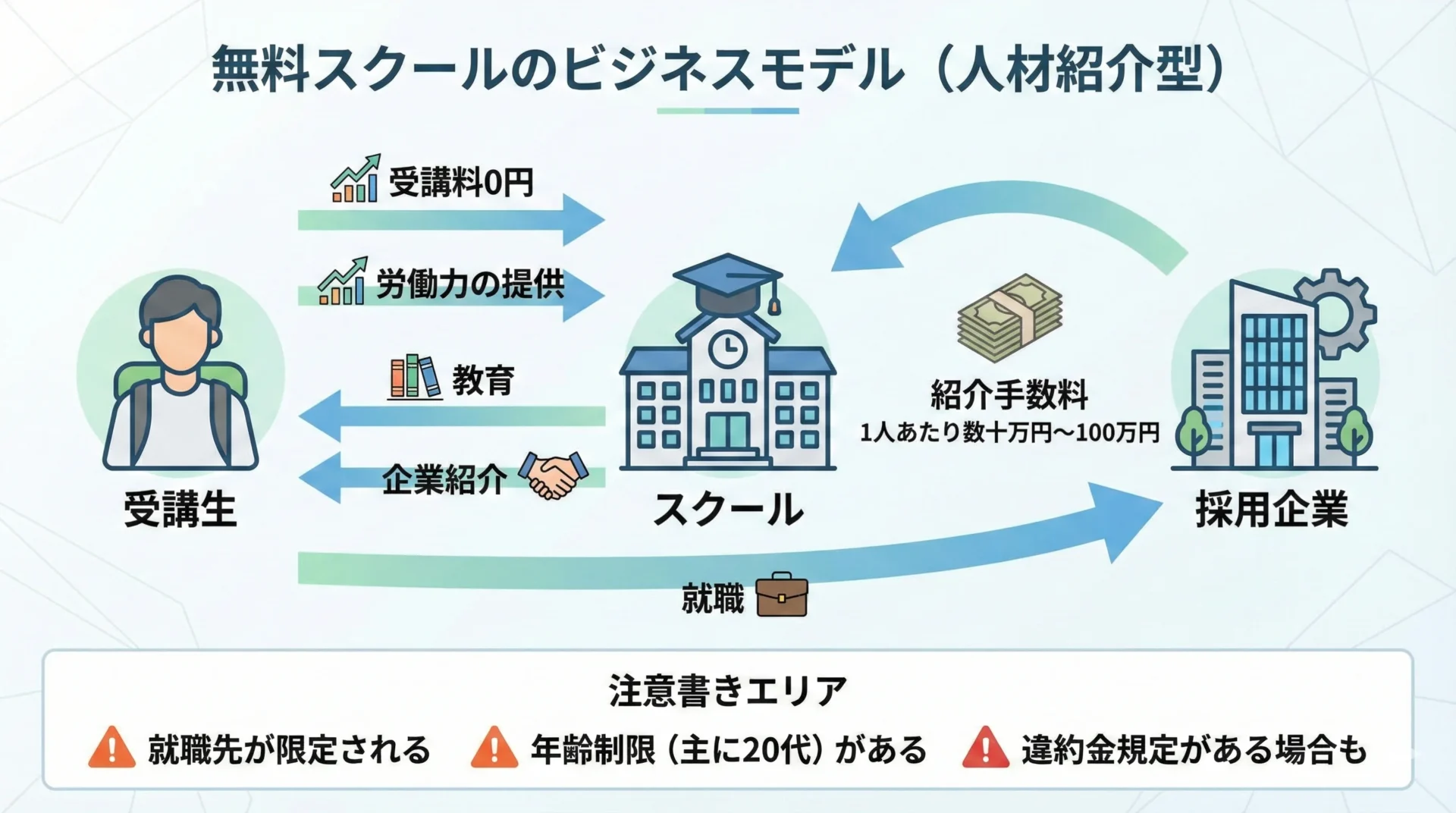 なぜ無料なのかというと、スクールが紹介する企業に就職することで、企業側から「紹介料(協賛金)」を受け取るビジネスモデルだからです。