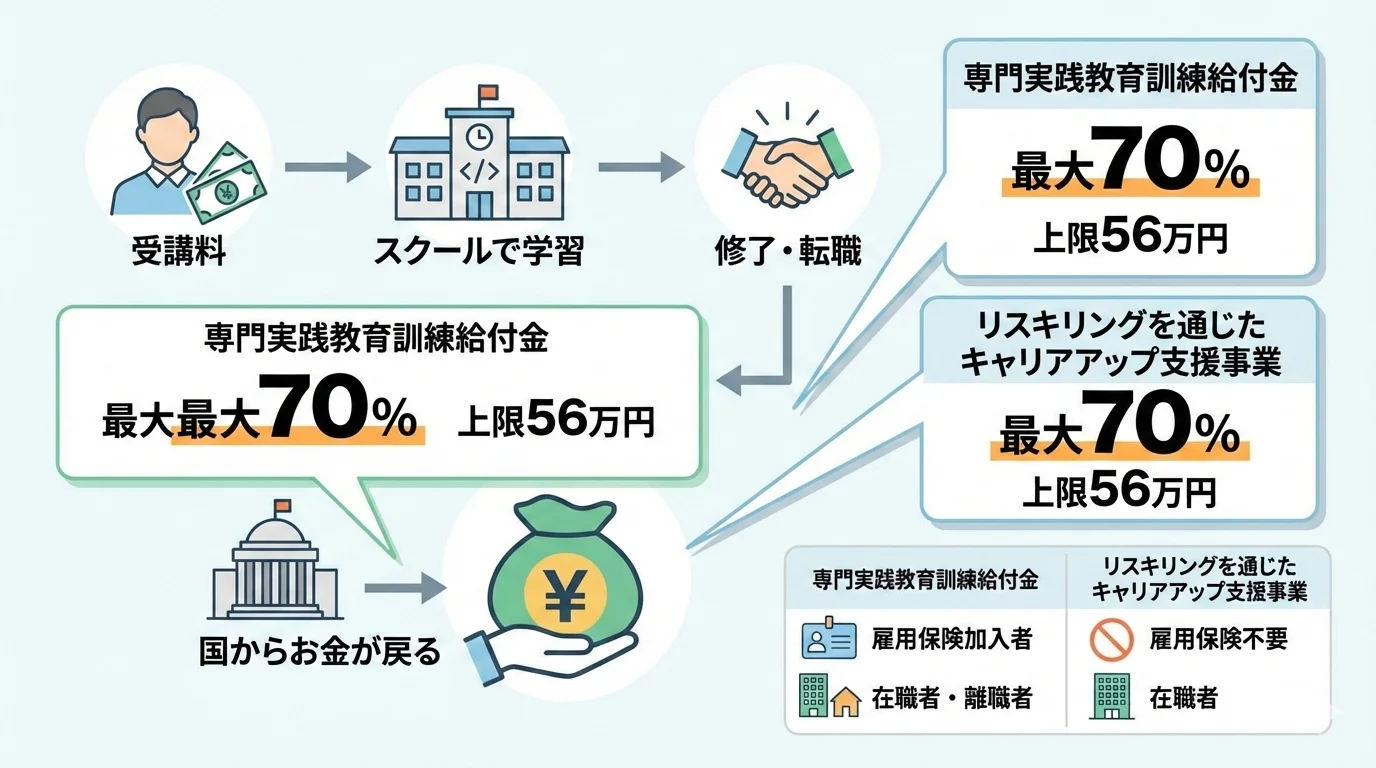 国のリスキリング支援策の拡充により、条件を満たせば最大70%〜80%の給付金を受け取れる制度が定着しており、実質負担額を大幅に抑えることが可能になりました。