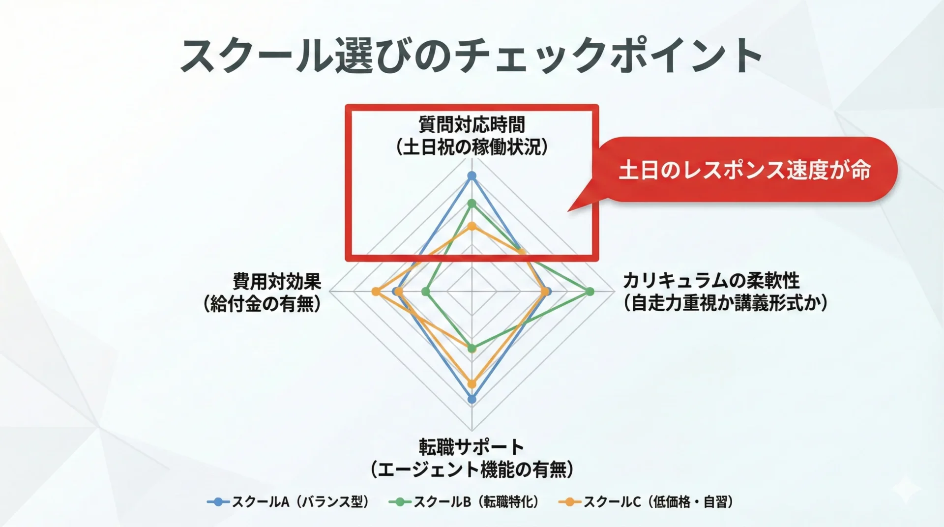 2. スクール選び: 土日のリアルタイム質問対応があるかを徹底確認する。