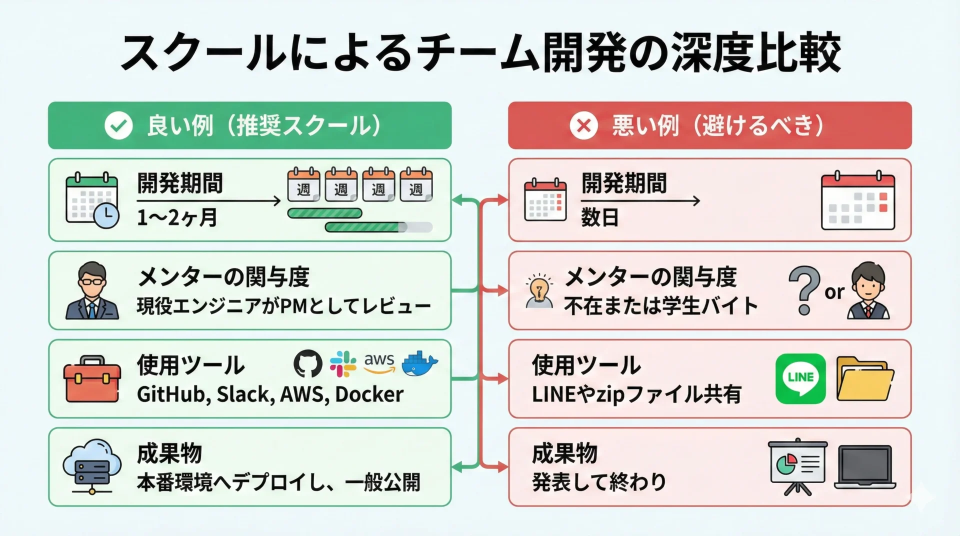 単に「グループワークがある」だけでなく、現場同様のGitフローやコードレビュー文化が根付いているかという視点で徹底比較しました。