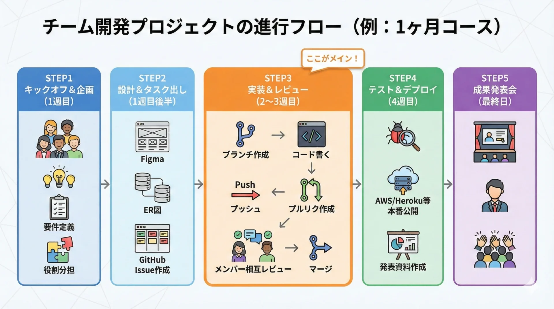 ここでは、一般的なプログラミングスクールのチーム開発カリキュラムで体験する「開発の1サイクル」を図解と共に解説します。