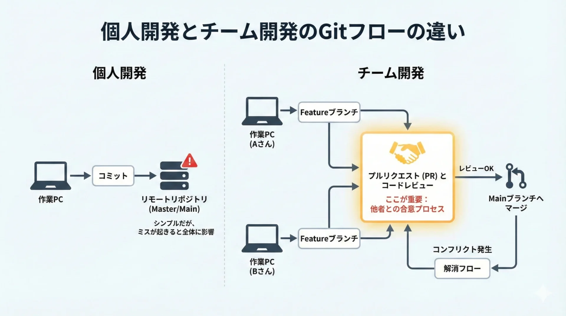 個人開発では git add、git commit、git push 程度の操作で完結しがちですが、チーム開発では全く異なる操作と作法が求められます。