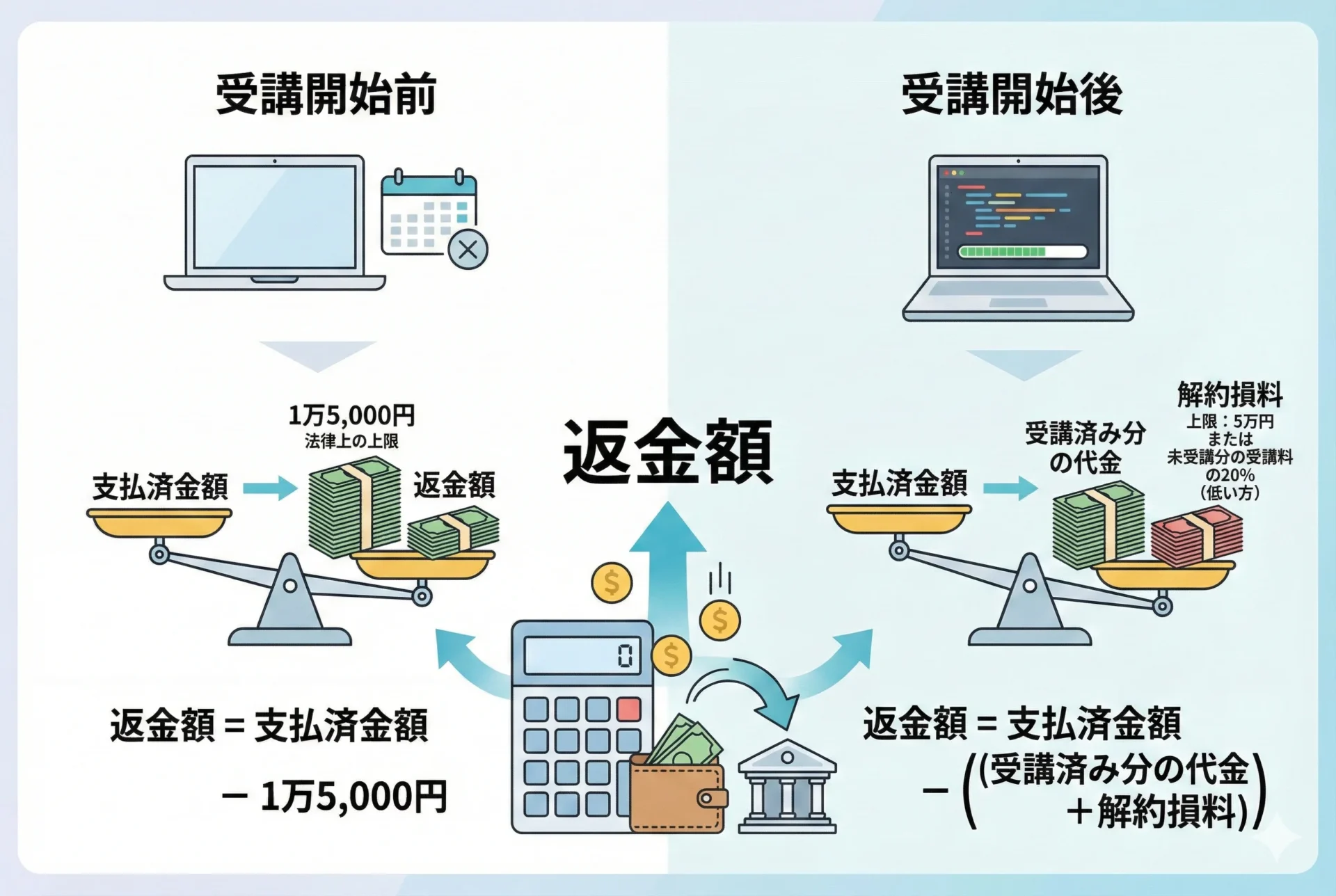 返金額 = 支払い総額 -(すでに受けたサービスの対価 + 解約損料)