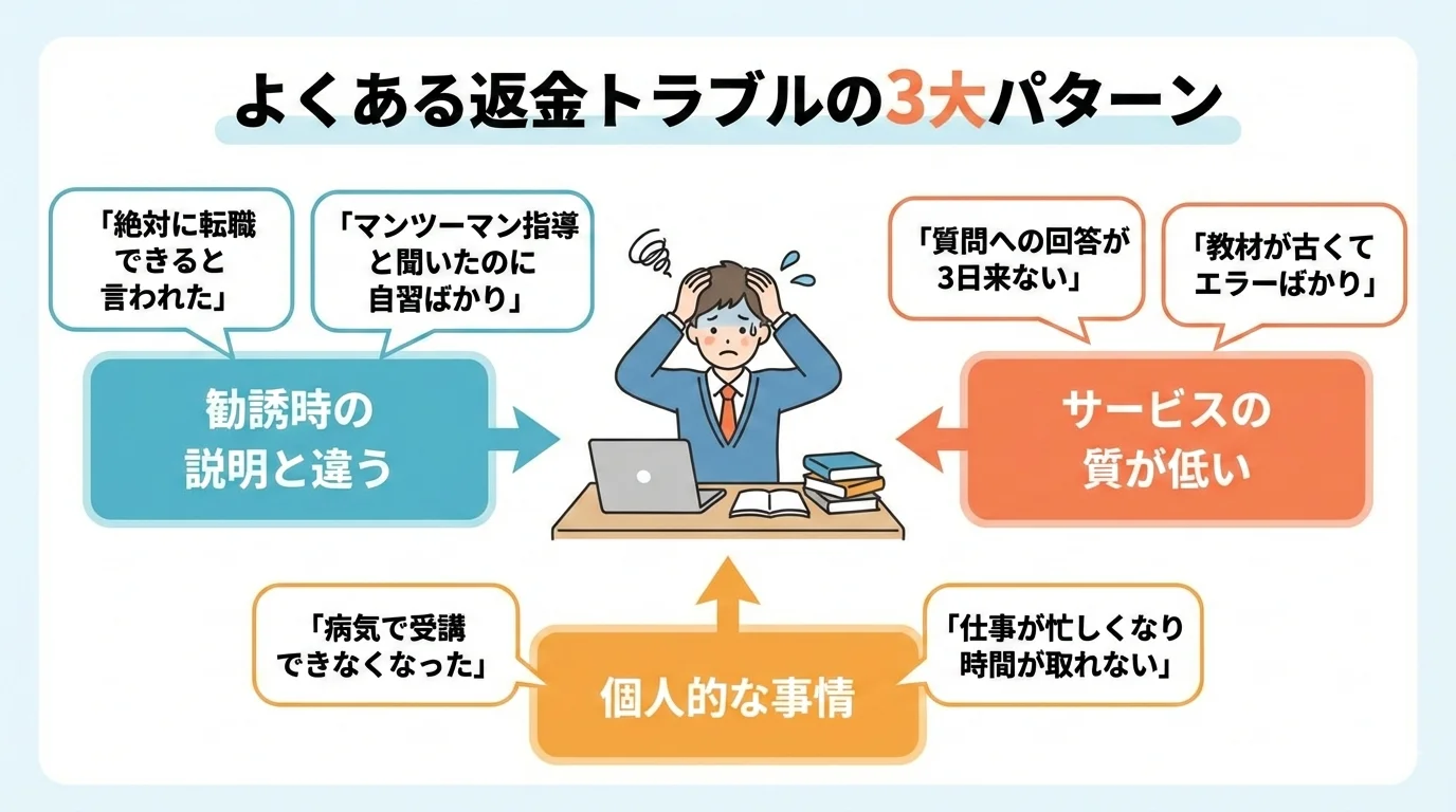 「エンジニアになって人生を変えたい」という強い思いで入会したものの、実際に受講してみると「想像していた内容と違った」「講師の質が低すぎる」「転職保証といっていたのに紹介がない」といった理由で解約や返金を検討するケースは少なくありません。