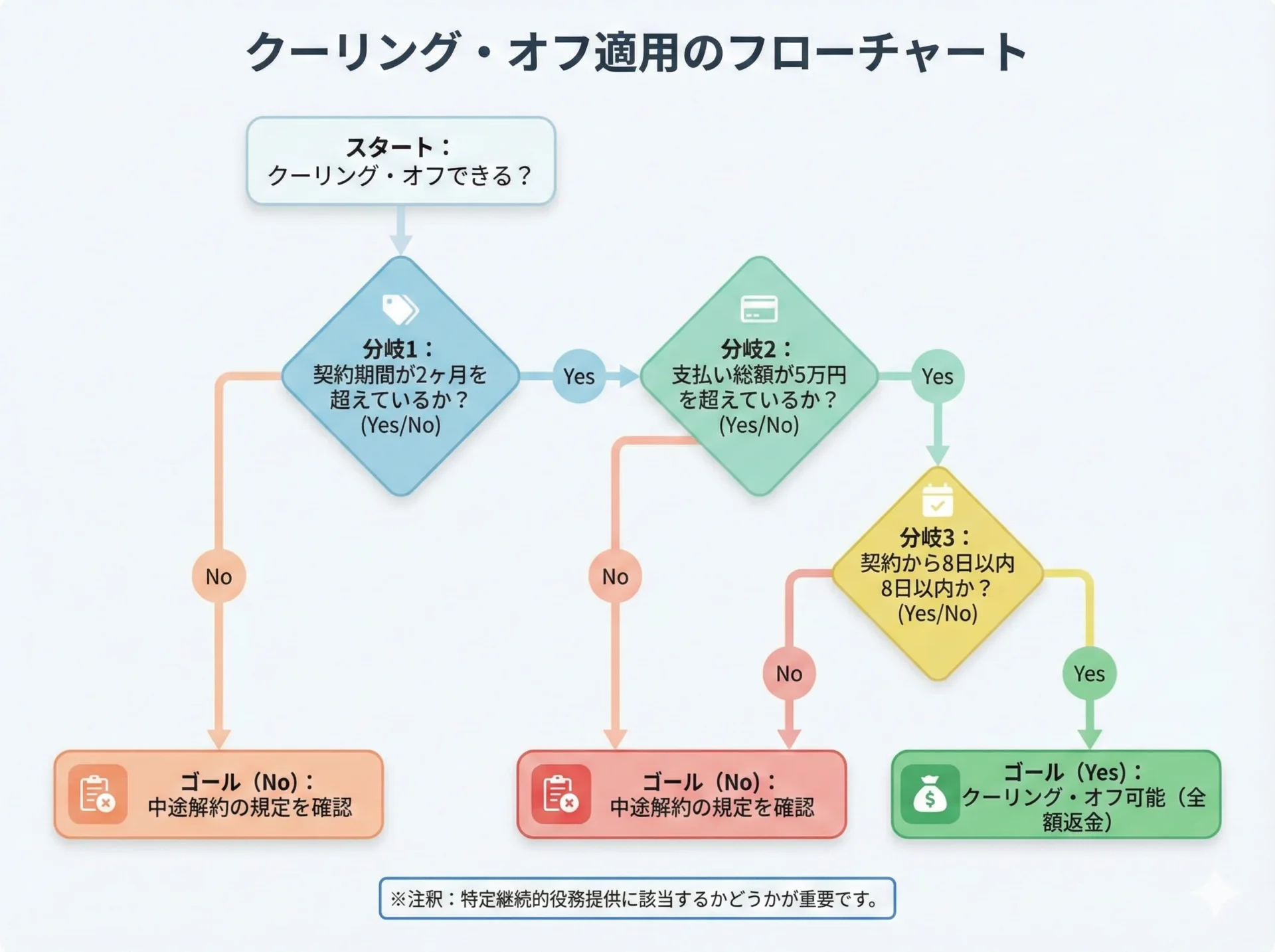- まずはクーリング・オフ(8日以内)が可能か確認する契約期間2ヶ月超、総額5万円超であれば適用の可能性大です。