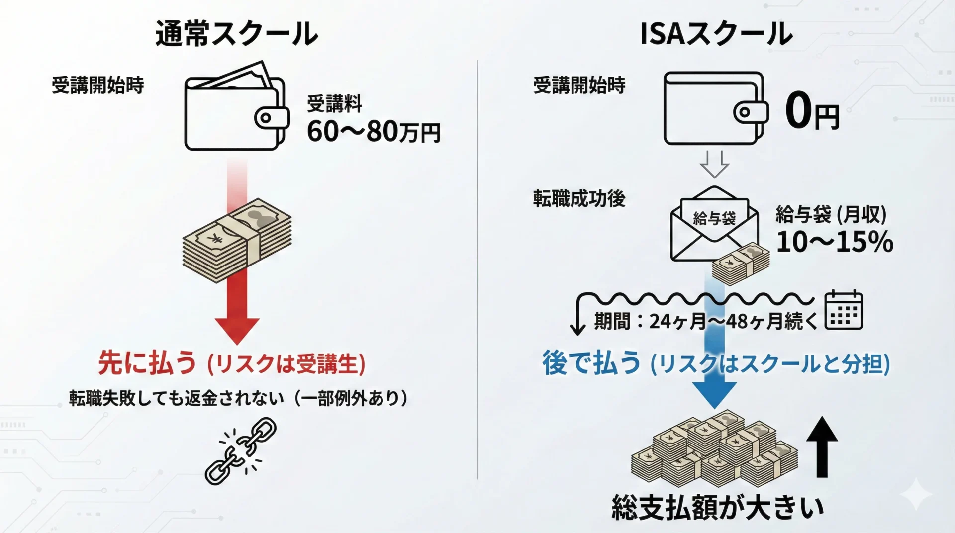 - 比較: ISAで100万円払うリスクを負うより、ここで給付金を使って実質20〜30万円で学ぶ方が、トータルの出費は安くなるケースが大半です。