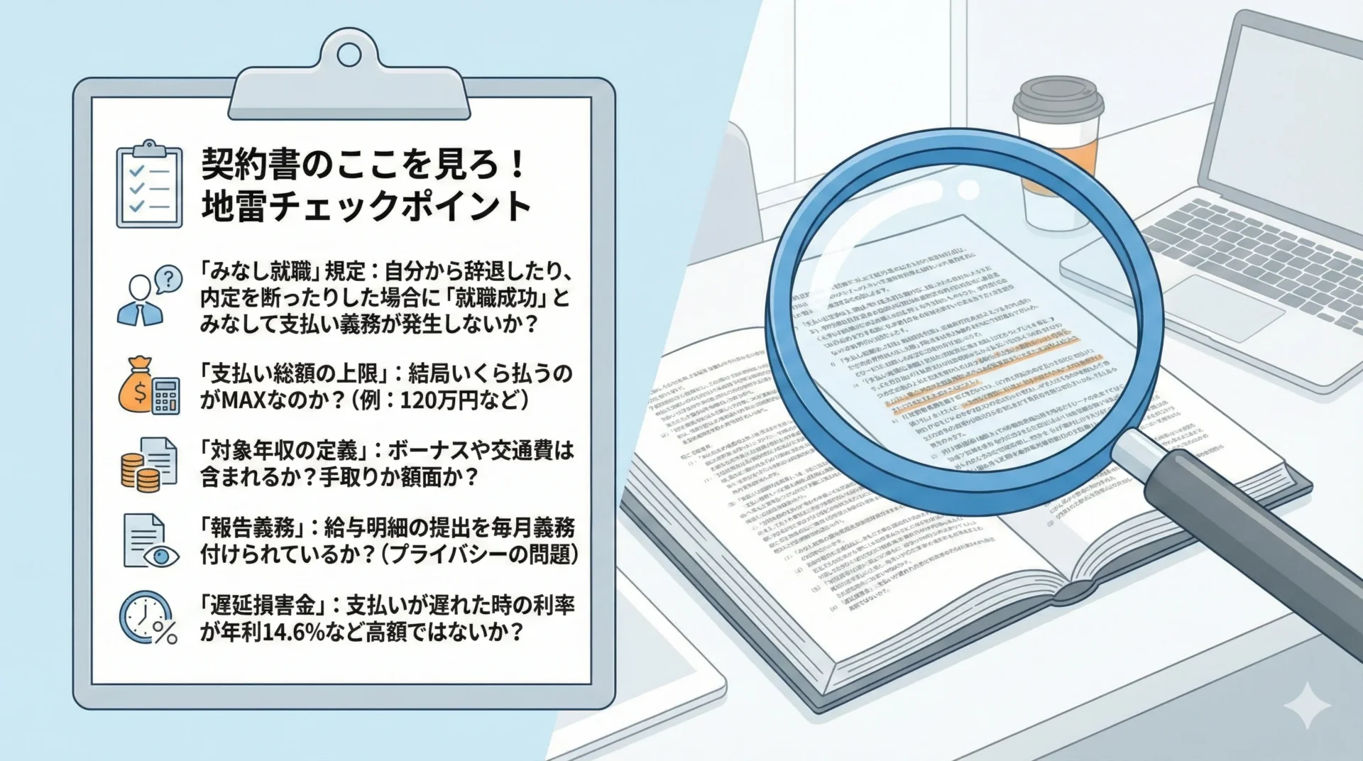 - 契約書は隅々まで読む:特に「辞めた時」「内定を断った時」の条項が最大の地雷ポイント。