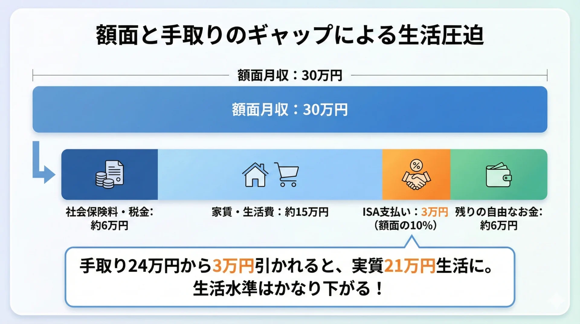 - 手取り給与への影響を計算せよ:額面の10%天引きは、生活実感としてかなり重い負担になる。