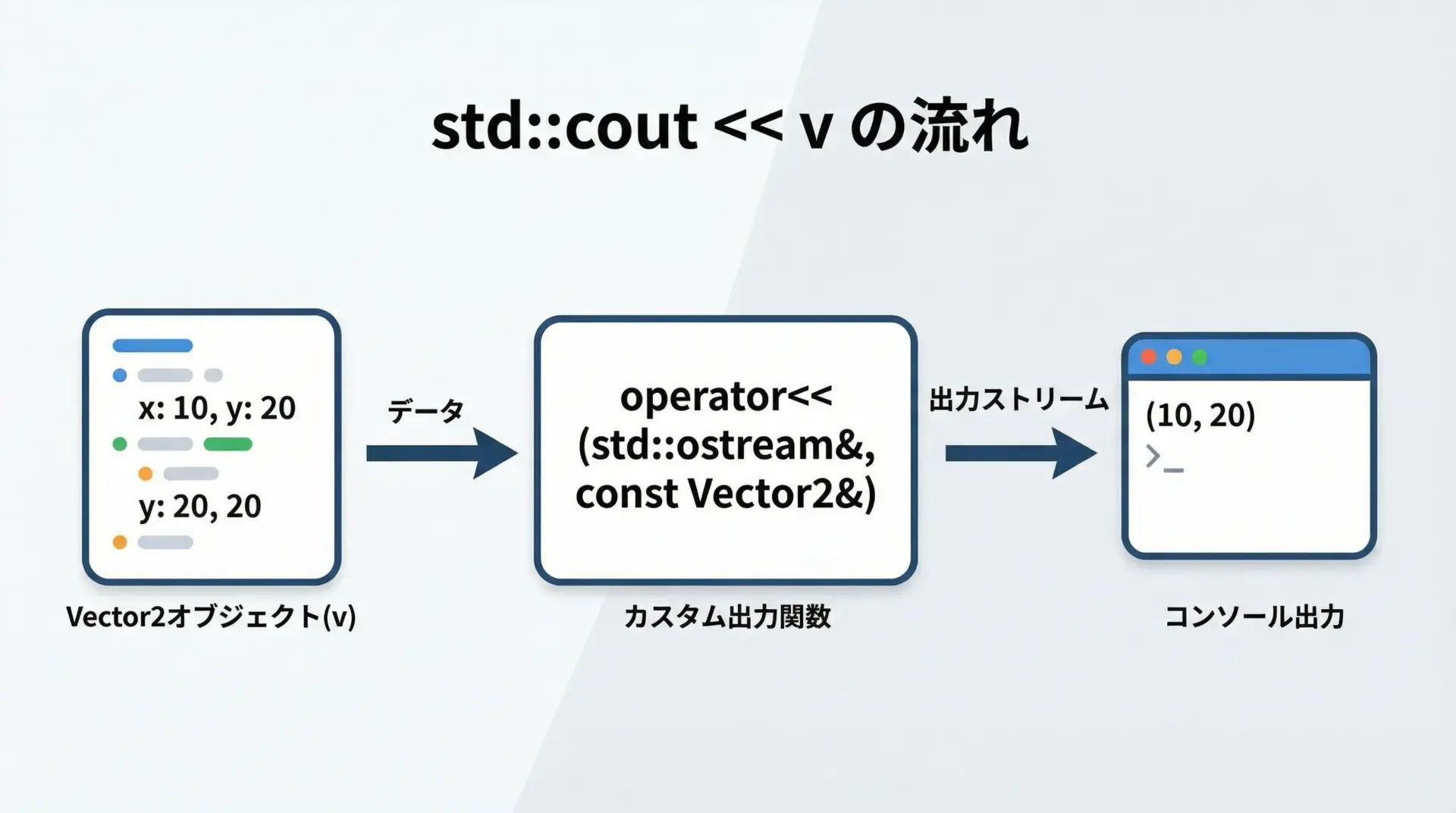 戻り値をstd::ostream&にすることで、出力のチェーンを自然に書けるようになります。