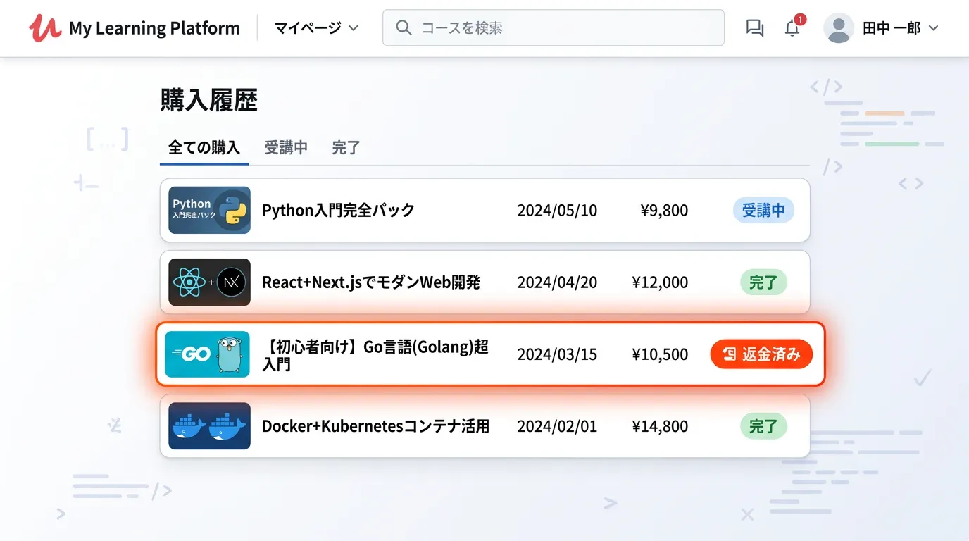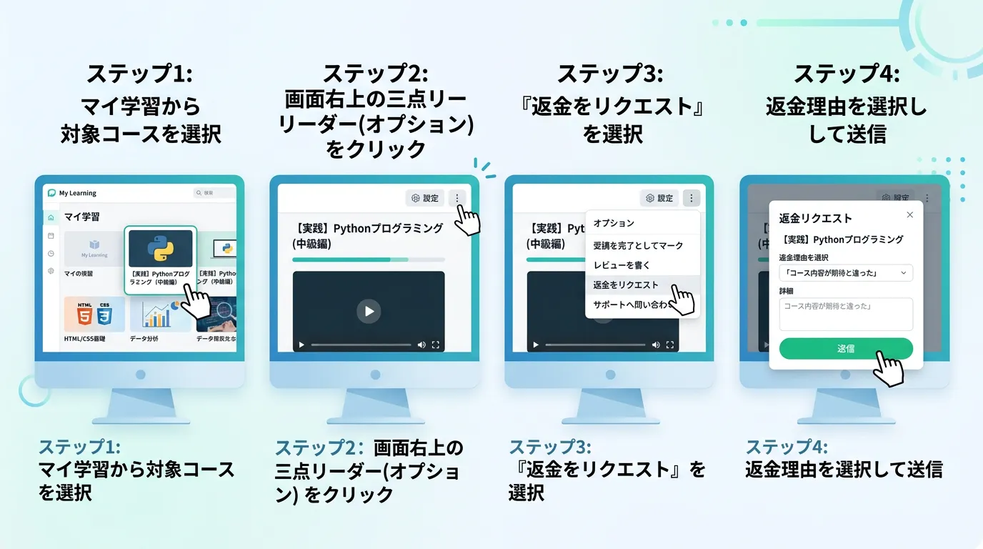 ただし、再購入したコースを再び返金しようとする場合、2回目は返金保証の対象外となることが多いため注意してください。