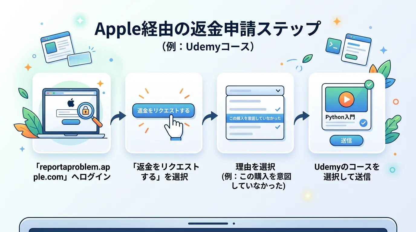 また、Appleの判断基準はUdemy独自の基準とは異なるため、必ずしも返金が承認されるとは限らないという点に注意が必要です。