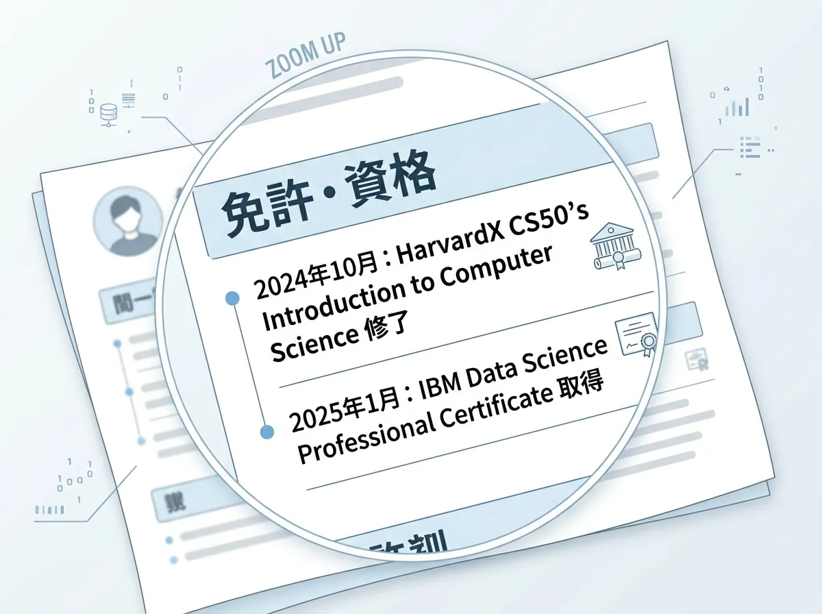 - スキルを具体化する: 単に修了しただけでなく、「Pythonを用いたデータ分析スキルの習得」など、具体的な成果を付け加えます。
