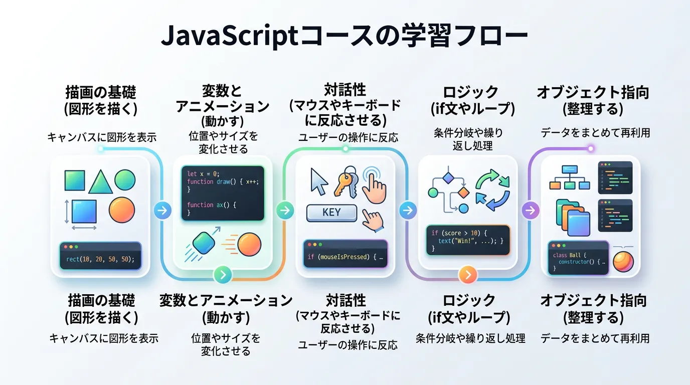 このコースの魅力は、「書いたコードがすぐに絵として動く」点にあります。