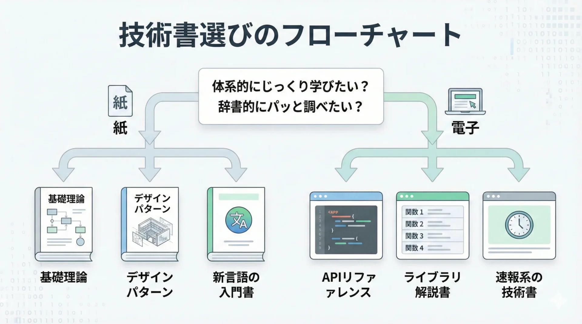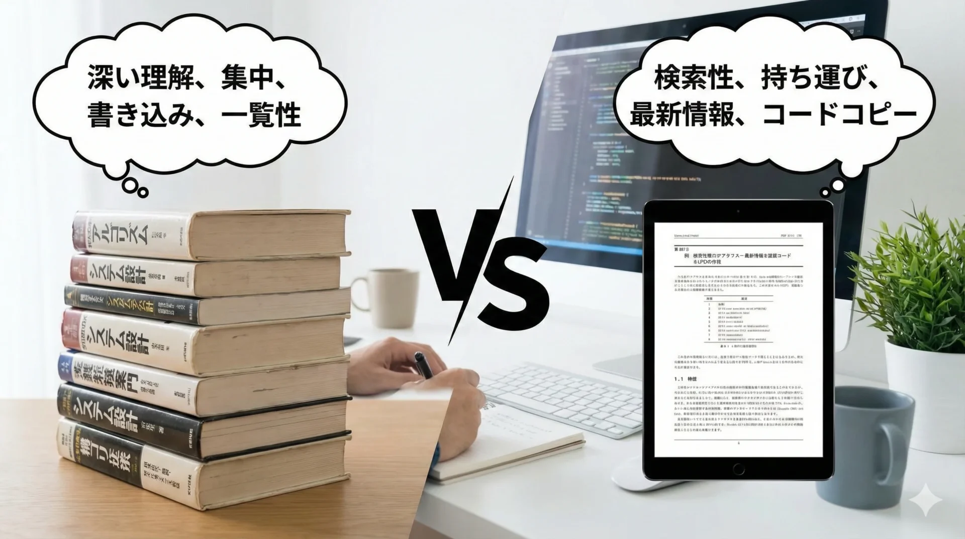 技術書を「紙」で買うか「電子」で買うかという問いに対する答えは、「思考を伴う基礎学習は紙、スピードと検索を求める実践利用は電子」という使い分けに集約されます。