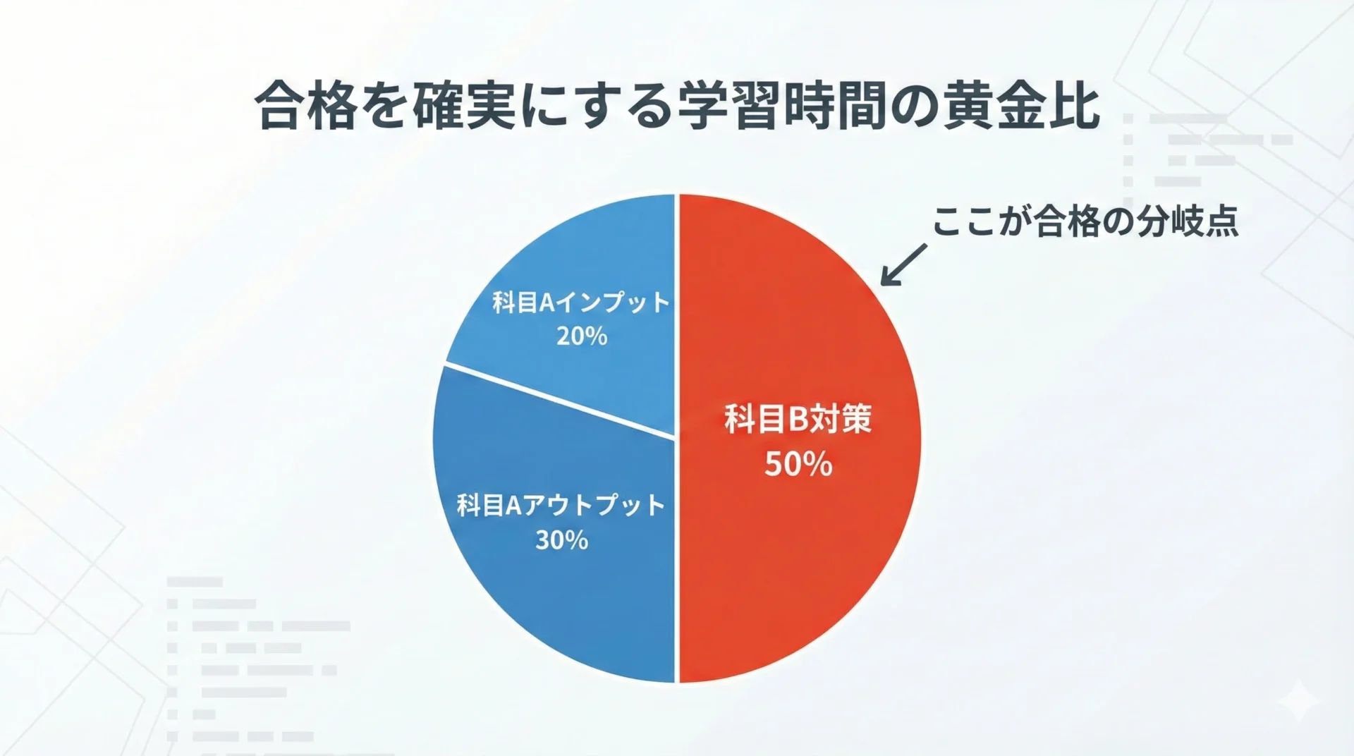 合格者の多くは、科目Aに4割、科目Bに6割の時間を配分しています。