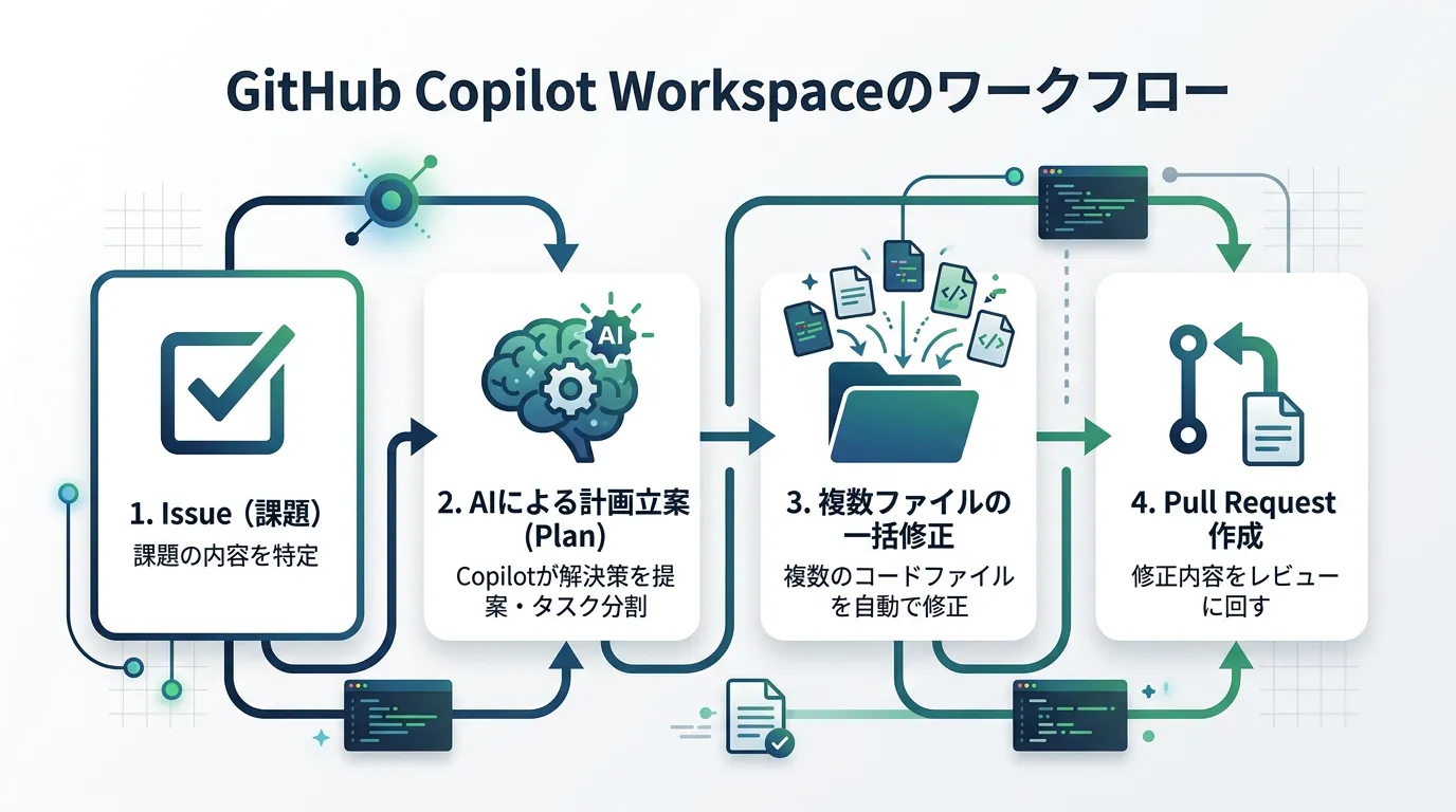 2026年におけるGitHub Copilotの最大の進化は、「Copilot Workspace」の一般化です。これにより、単なる行単位の補完ではなく、GitHub上の「Issue(課題)」を読み取り、リポジトリ全体の構造を理解した上で、複数のファイルにまたがる修正案を自動生成してくれます。