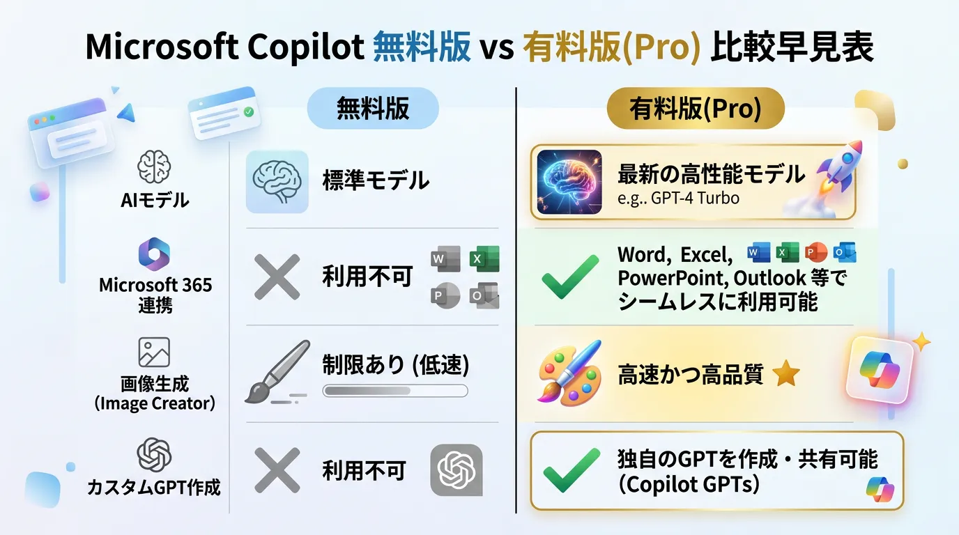 Microsoft Copilotの無料版と有料版 (Copilot Pro) の違いは、単なる「回数制限の有無」に留まりません。