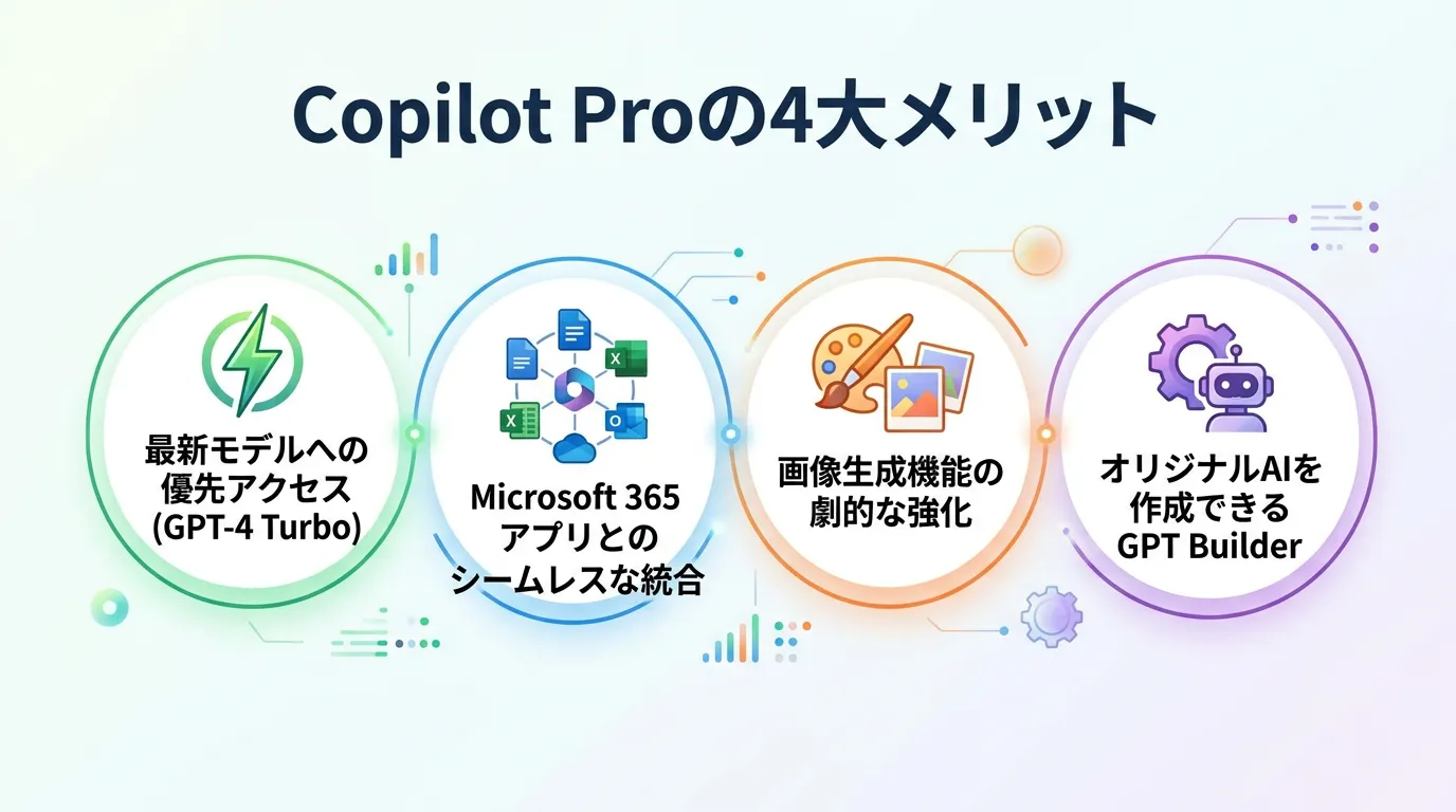 無料版でも十分に高性能なAIとの対話が可能ですが、Copilot Proは「プロフェッショナルな生産性向上」を目的としたブースト版として位置づけられています。