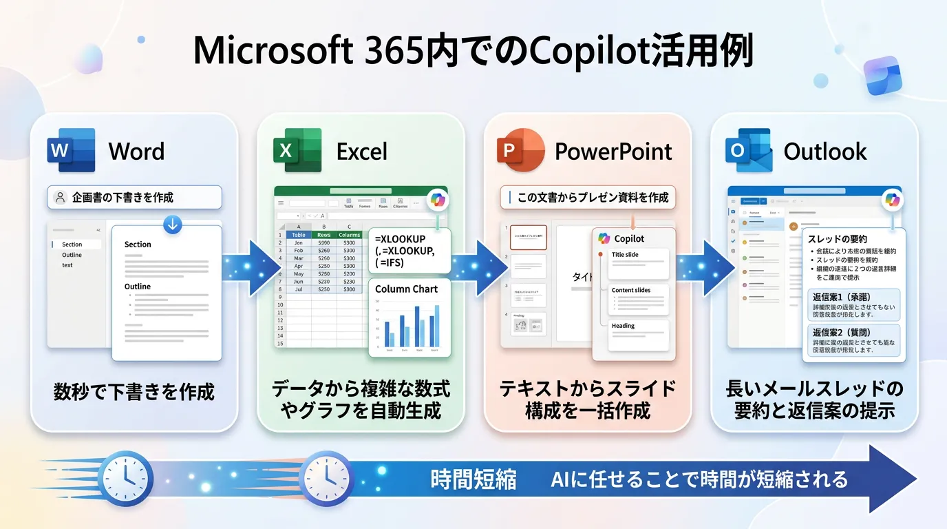 Word、Excel、PowerPoint、Outlook、OneNoteといった、仕事や学習で欠かせないソフトウェアの中で、Copilotが直接アシスタントとして機能します。