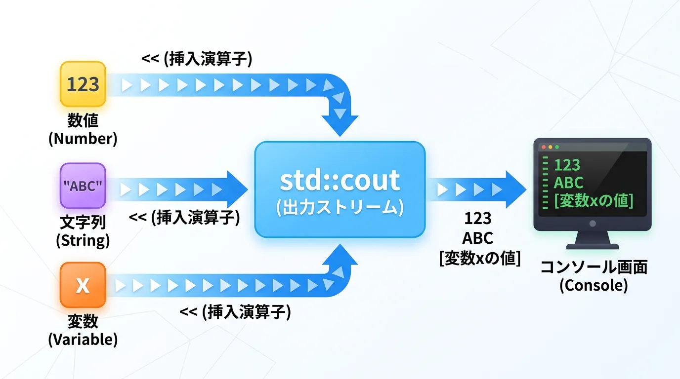 このように、異なるデータ型(文字列と整数など)が混在していても、自動的に判別して出力してくれるのがstd::coutの大きなメリットです。